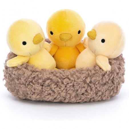 Trois petits poussins Jellyca t qui gloussent. Que ce soit dans ou hors de leur nid douillet, ces adorables poussins aiment se serrer les coudes.