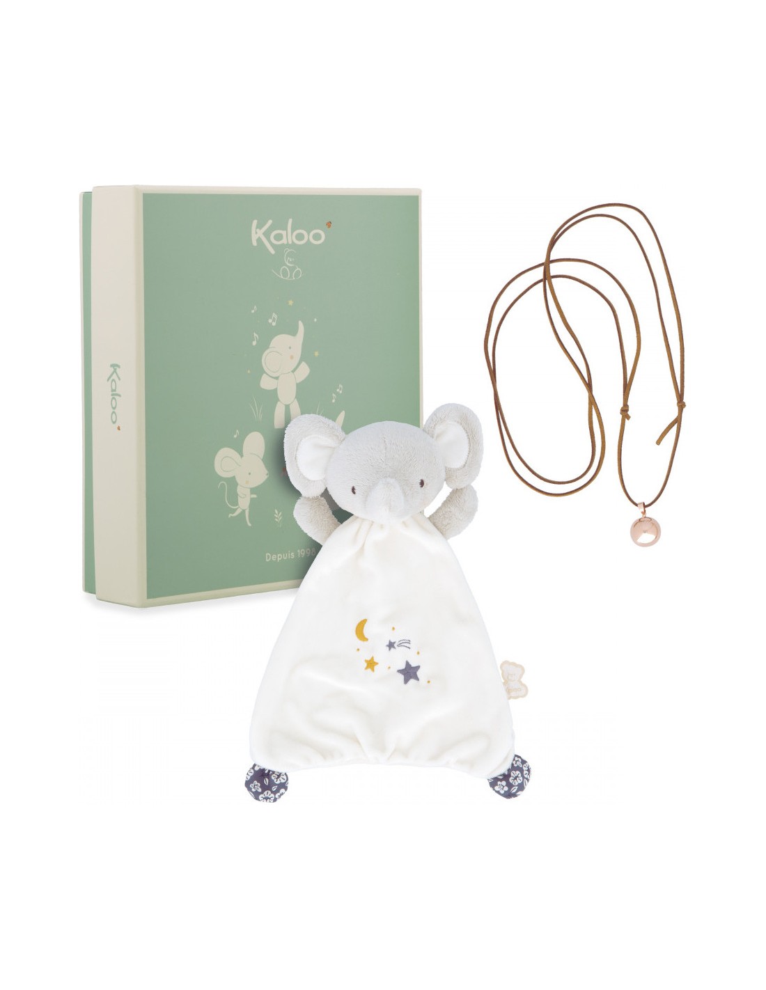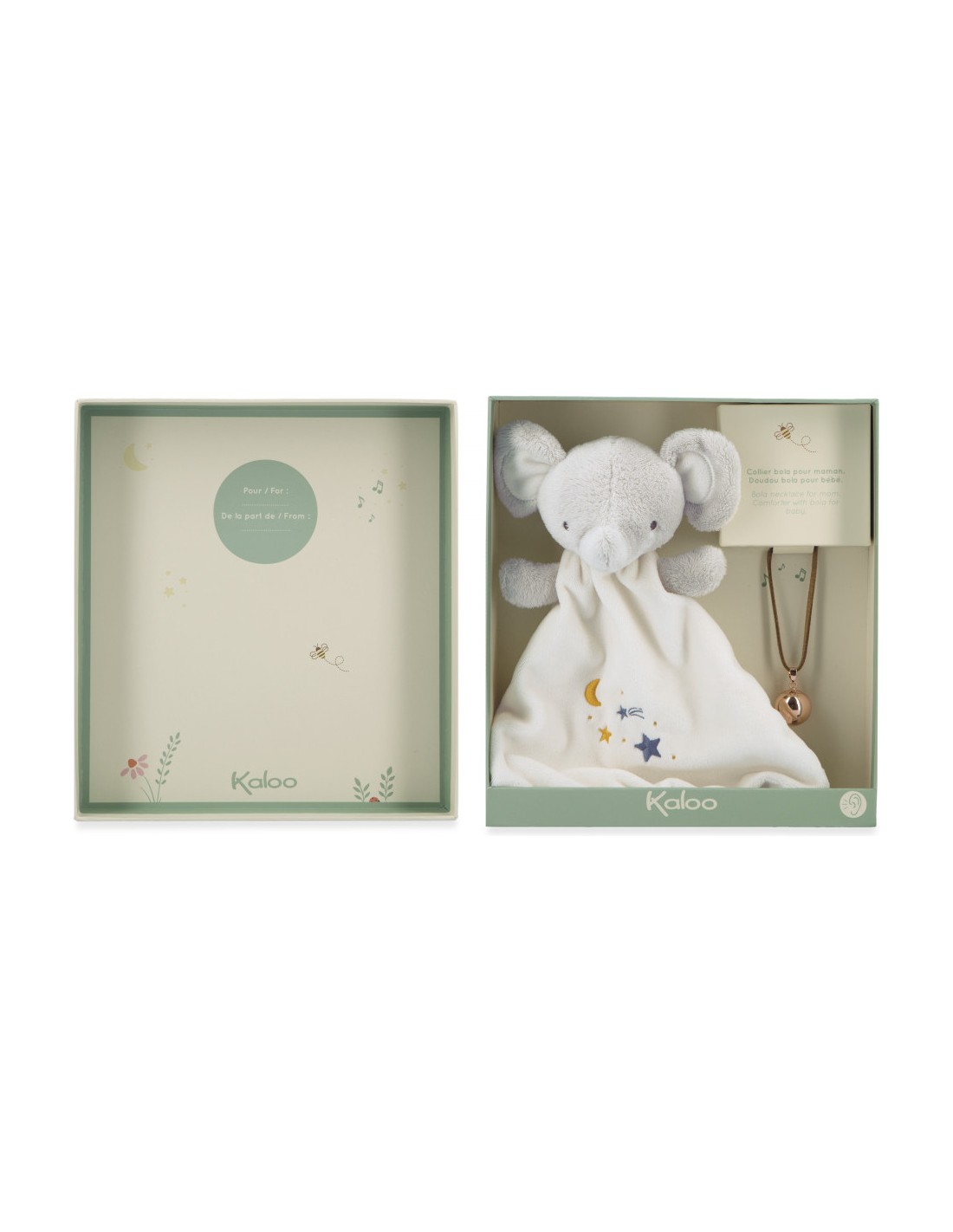 Le doudou éléphant peut être lavé en machine à 30°. L’ensemble de ces produits dédiés à l’apaisement et l’éveil de bébé sont présentés dans un joli coffret cadeau personnalisable, grâce à l’encart disponible sous le couvercle. Ce coffret bola et doudou éléphant fait partie de la collection Petites Chansons de Kaloo : une gamme dédiée à l’éveil aux sons, développée avec une équipe de psychomotriciens et composée d’une variété de sonorités pour stimuler bébé.