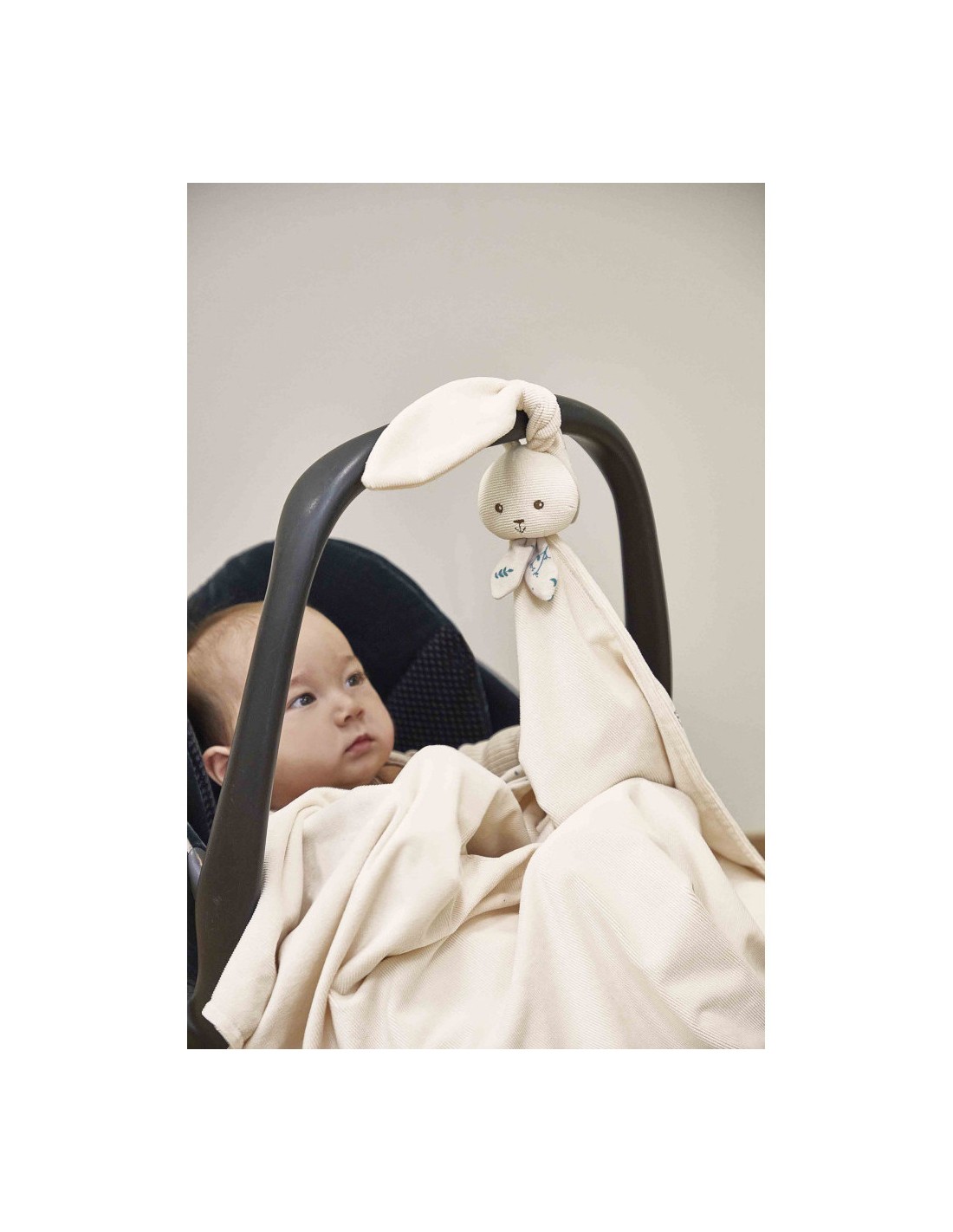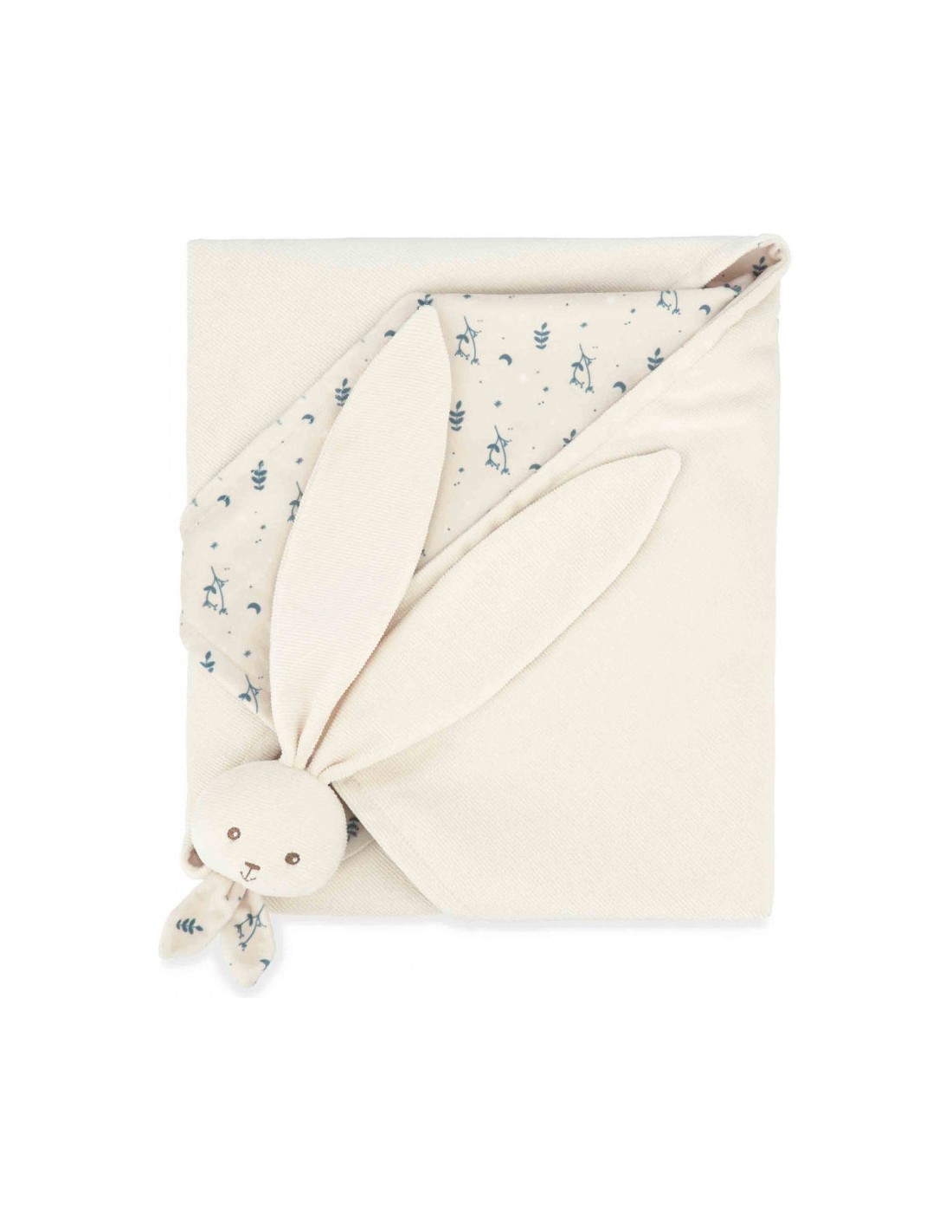 Son foulard délicatement noué, parfaitement assorti à la couverture, apporte une touche d’élégance. Grâce à ses longues oreilles qu'on peut nouer, la couverture est dotée d'un système d’attache ingénieux pour suivre bébé dans toutes ses aventures. Son design raffiné, couleur crème, avec d'un côté une face unie à la texture rassurante et de l'autre une face imprimée, allie élégance et poésie, fidèle à l’univers tendre de Kaloo.