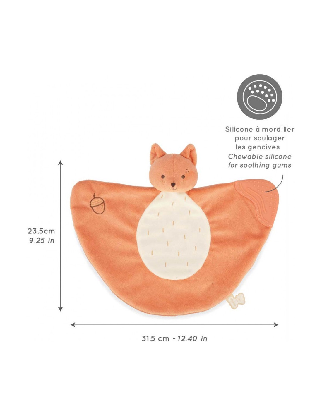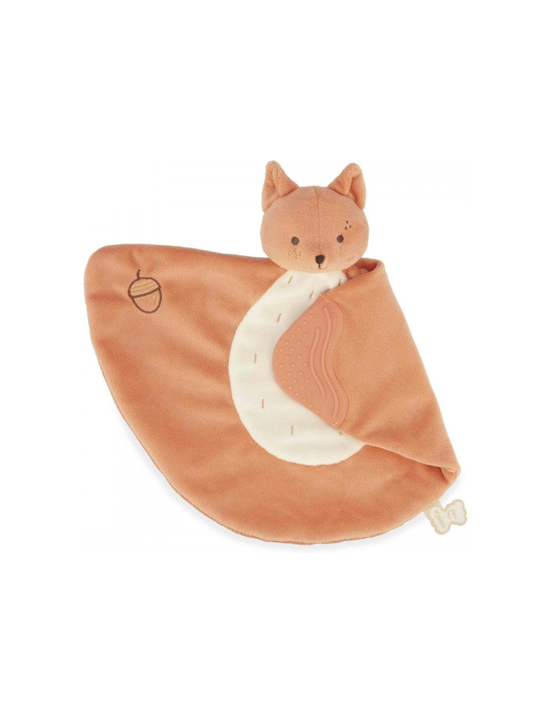 Ce doudou écureuil est le compagnon idéal pour les poussées dentaires de bébé ! Cadeau de naissance utile et original, ce doudou de dentition possède une extrémité ornée de rainures et de petits picots qui massent en douceur les gencives douloureuses de bébé. Apaisante, cette partie souple en silicone peut être mise à la bouche à l'infini !