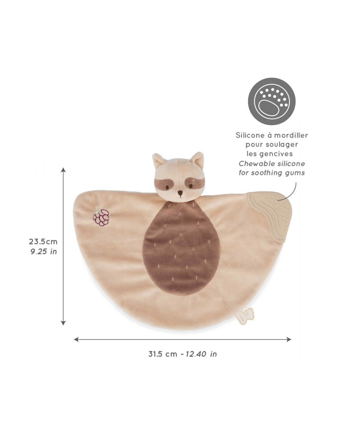 Ce doudou raton-laveur est le compagnon idéal pour les poussées dentaires de bébé ! Cadeau de naissance utile et original, ce doudou de dentition possède une extrémité ornée de rainures et de petits picots qui massent en douceur les gencives douloureuses de bébé. Apaisante, cette partie souple en silicone peut être mise à la bouche à l'infini !