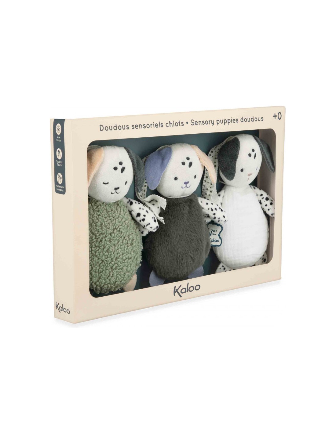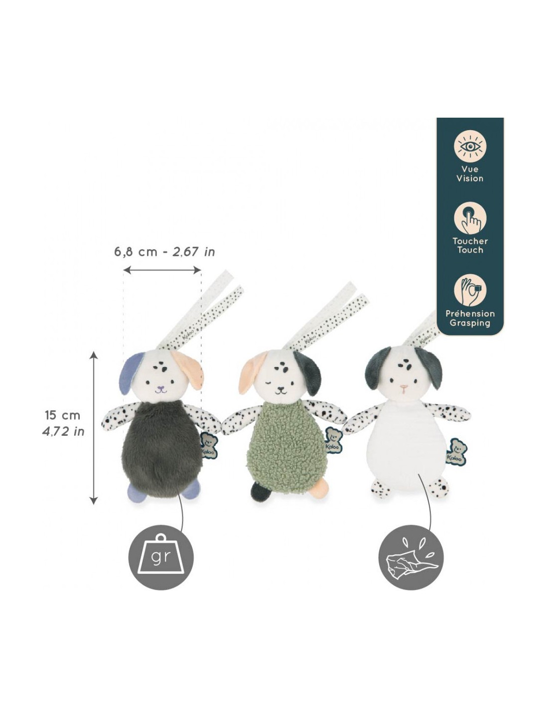 Accrochez ces petites peluches en forme de chien et laissez votre enfant profiter de ces jeux d'éveil sensoriels. Ce lot de 3 doudous sensoriels fait partie de la gamme Stimuli de Kaloo, développée en collaboration avec des psychomotriciens pour aider bébé à développer ses compétences sensori-motrices dès la naissance.