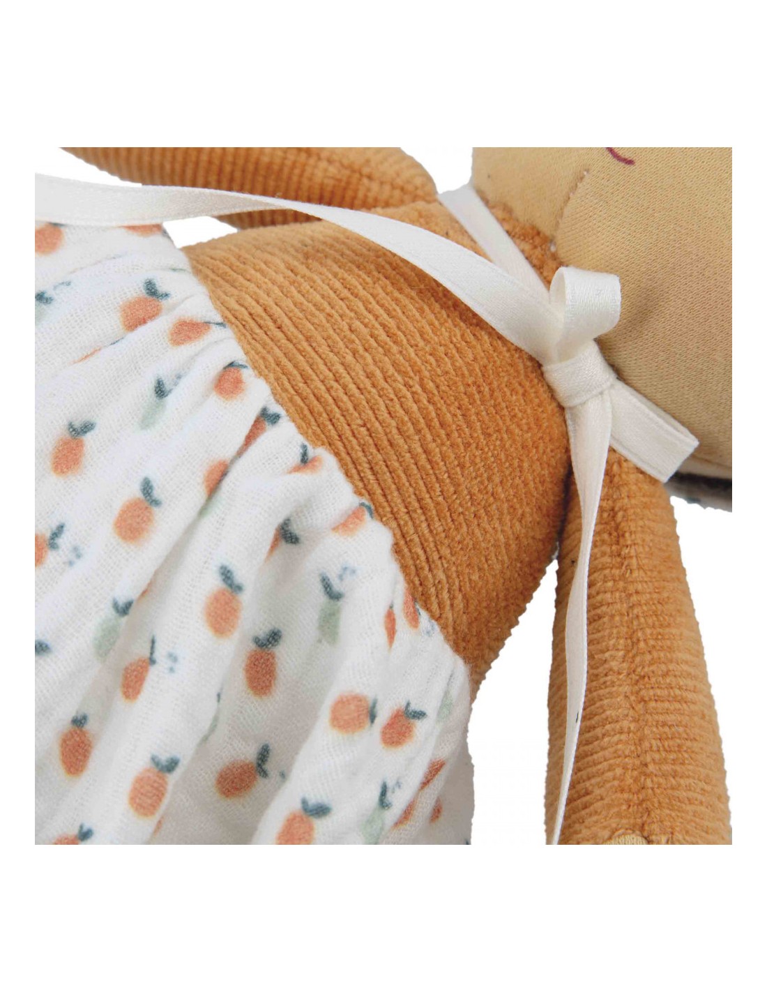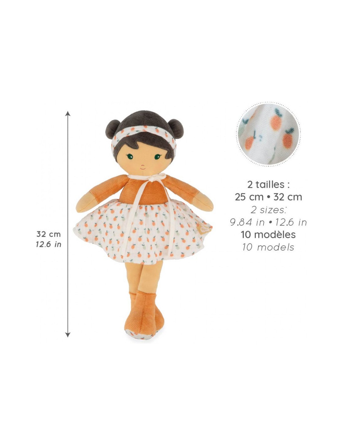 Un délicat bandeau, assorti à sa jupe, vient souligner ses doubles chignons, renforçant son allure joyeuse et pétillante ! D’une grande douceur, elle est parfaite à saisir et à câliner par les plus petits. Facile à emporter partout, Éloïse accompagne les enfants dans leurs plus tendres aventures. Toujours prête à partager les instants du quotidien, elle devient une véritable complice de jeu et de câlins. Éloïse rappelle l’esprit des journées à la campagne : celles où l’on s’allonge dans l’herbe pour observer les nuages et où l’on cueille des fruits mûrs sous le soleil.