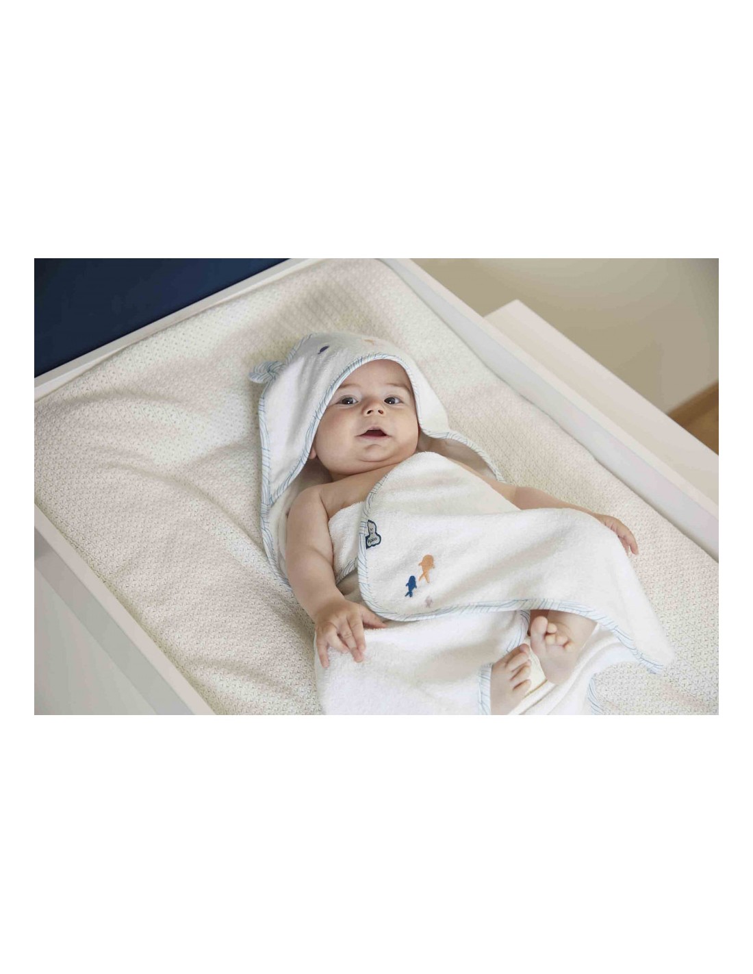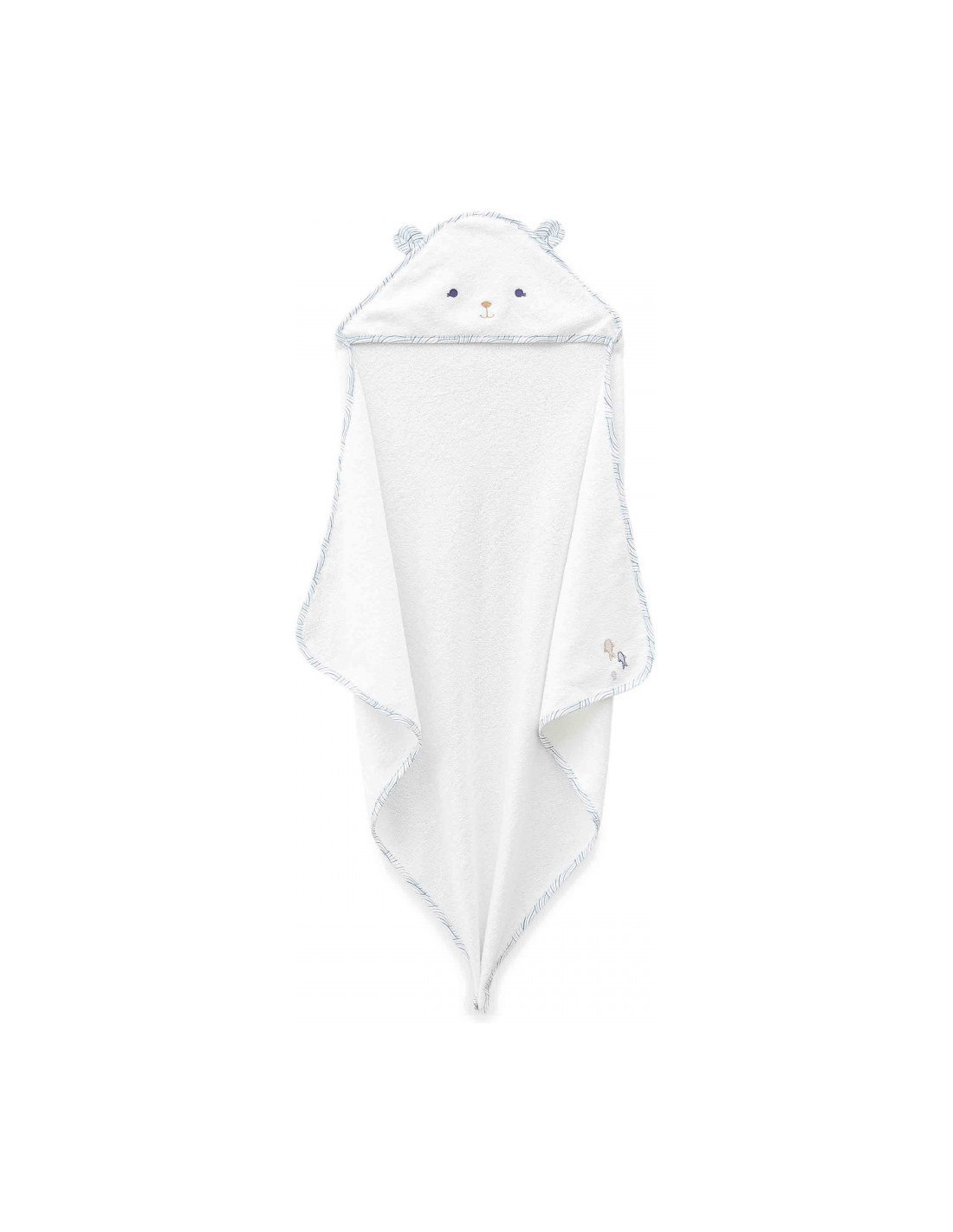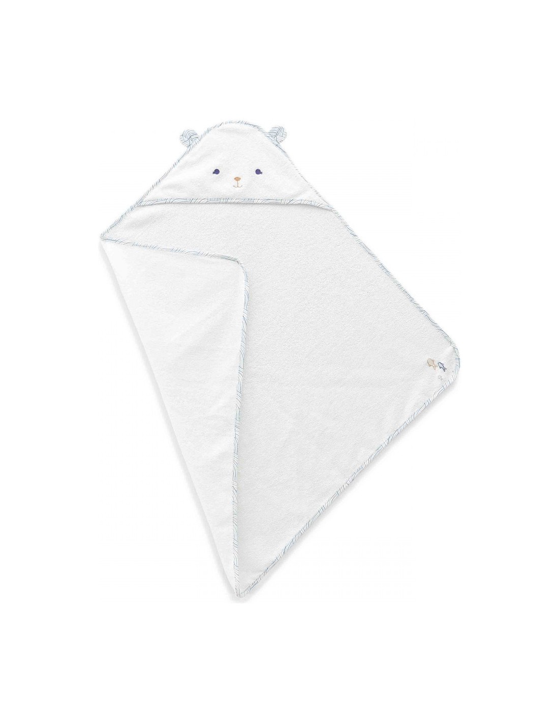 De jolis poissons sont brodés sur l'envers de cette cape de bain et des vagues habillent la bordure : ces détails rappellent le calme des profondeurs marines, loin des vagues agitées, et invitent au repos et à la douceur. Une fois enveloppé dans ce cocon rassurant, bébé reste bien au chaud avant d'être habillé.