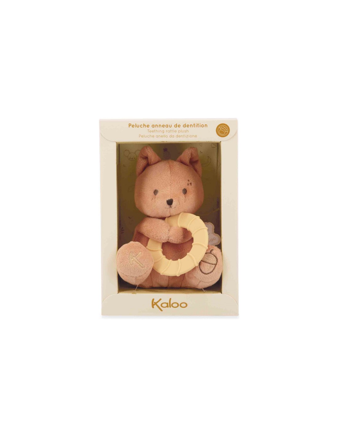 La peluche à offrir dès les premières poussées dentaires ! Accompagnée d'un anneau de dentition, elle apporte à la fois réconfort et apaisement à bébé. Entre ses pattes, cet adorable écureuil serre un anneau en silicone doté de reliefs conçu pour masser en douceur les gencives douloureuses de bébé.