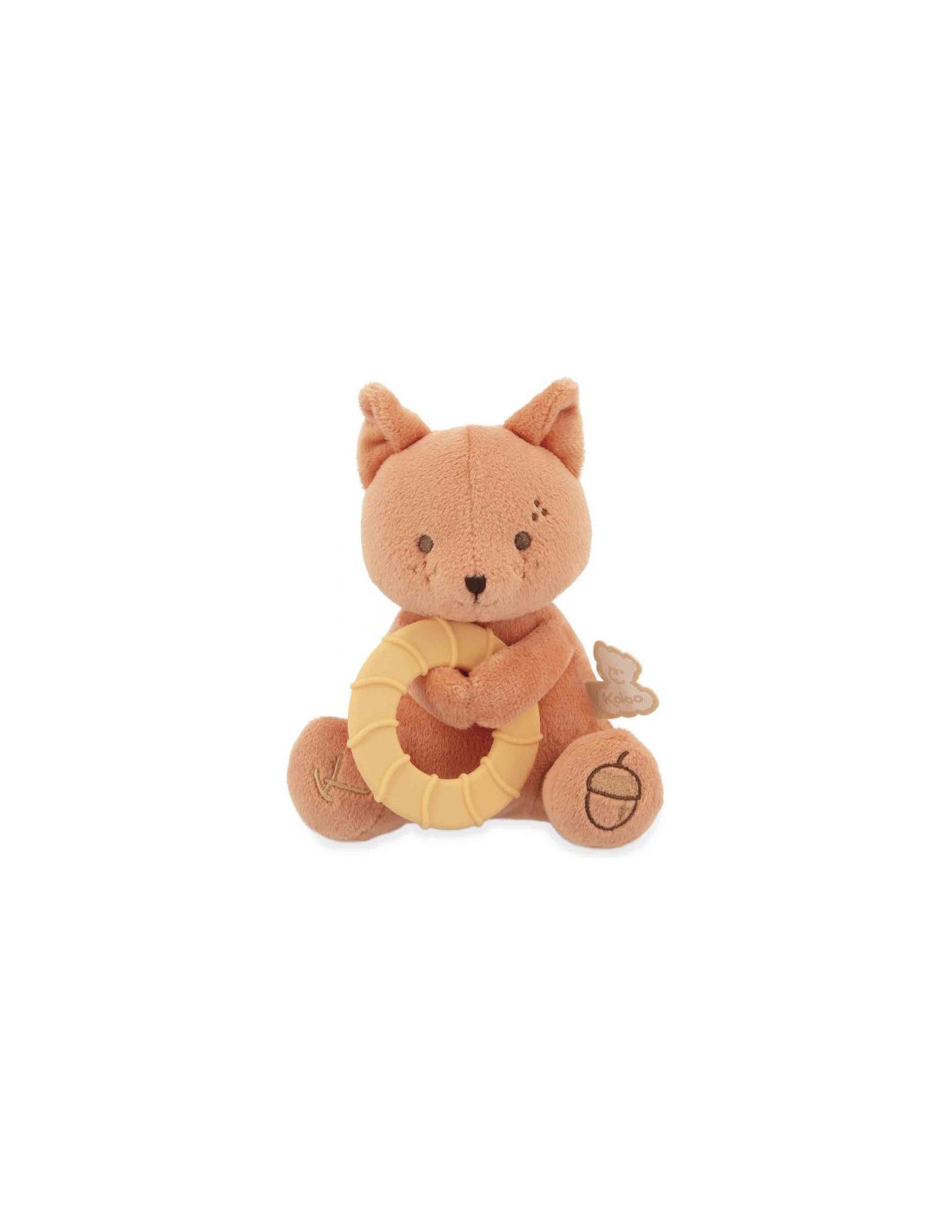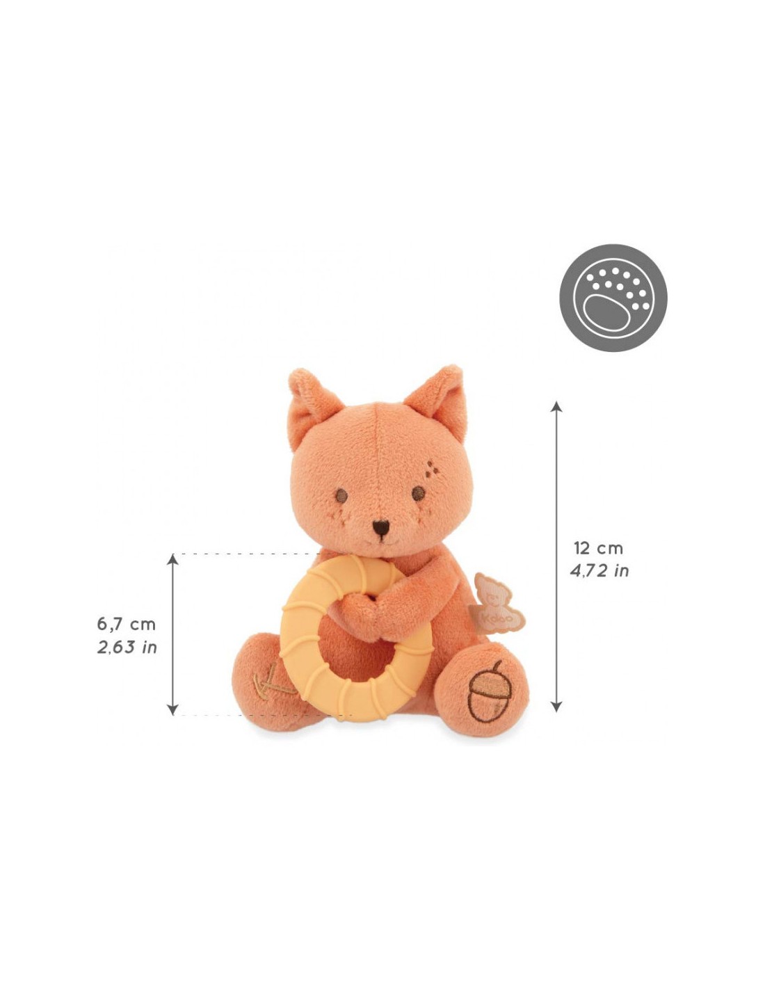 L'anneau mesure 12 cm et s'attrape facilement par les petites mains. Lorsque les dents travaillent, bébé peut mettre à sa bouche l'anneau à l'infini et faire de gros câlins à l'écureuil pour y trouver du réconfort. En plus de sa frimousse amicale, l'écureuil est en micro-velours, enveloppant bébé dans une incroyable douceur. Ce petit écureuil devient vite un repère affectif pour bébé, l’aidant à traverser les moments d’inconfort.