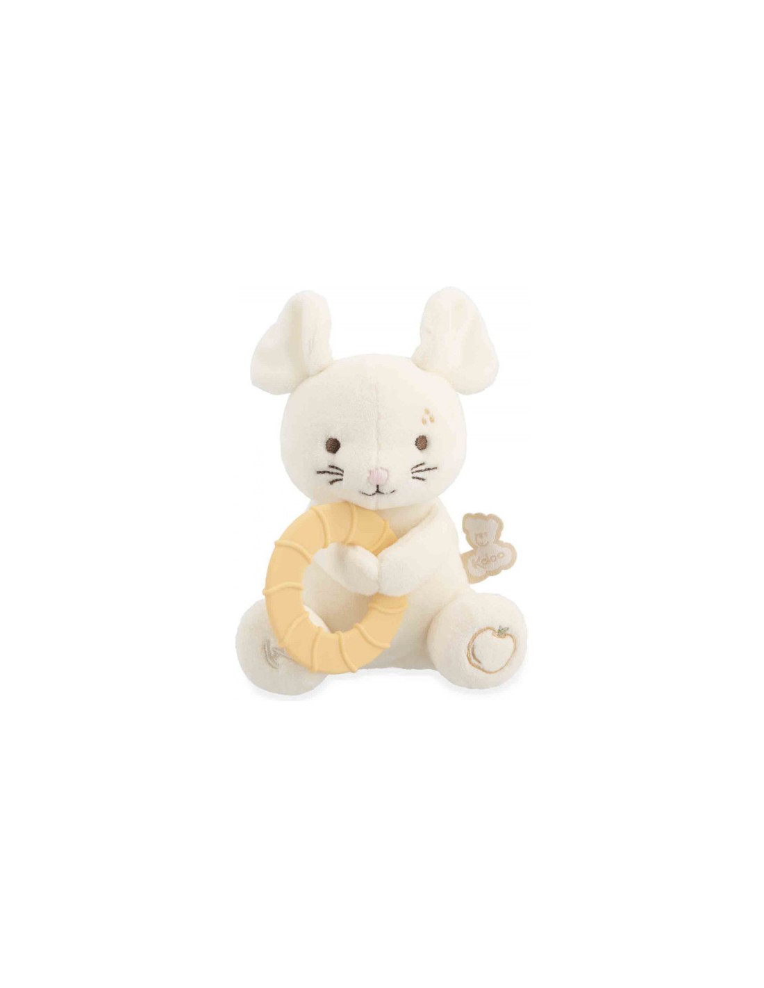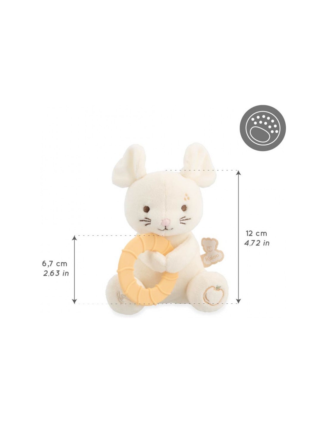 L'anneau mesure 12 cm et s'attrape facilement par les petites mains. Lorsque les dents travaillent, bébé peut mettre à sa bouche l'anneau à l'infini et faire de gros câlins à la souris pour y trouver du réconfort. En plus de sa frimousse amicale, la souris est en micro-velours, enveloppant bébé dans une incroyable douceur. Cette petite souris blanche devient vite un repère affectif pour bébé, l’aidant à traverser les moments d’inconfort.