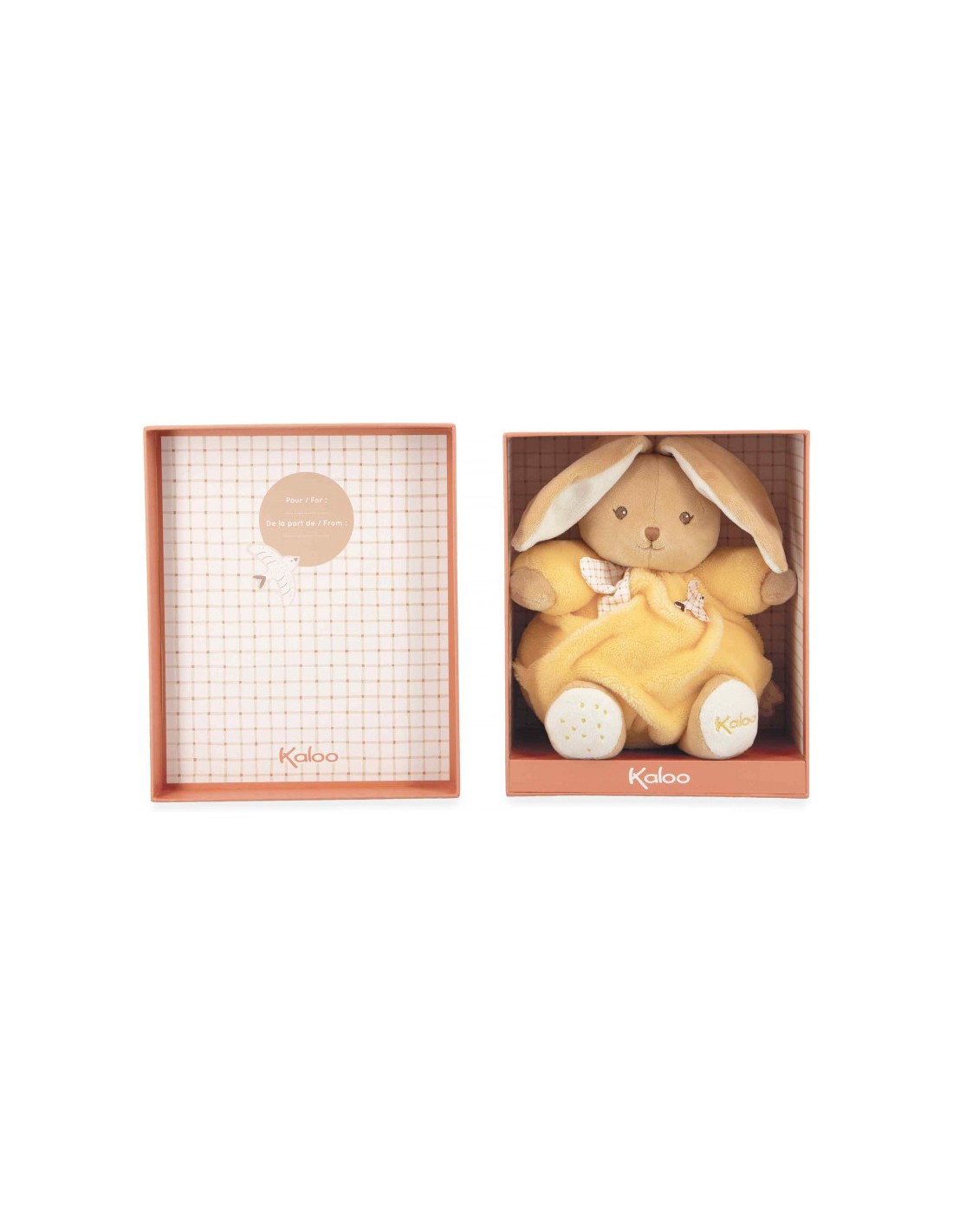 Cette peluche jaune est présentée dans une jolie boîte cadeau assortie, personnalisable grâce à l'encart disponible sous le couvercle. Le coffret peut être réutilisé comme boîte de rangement ou pour conserver les précieux petits souvenirs de bébé. Ce lapin Kaloo d’une intense douceur est le cadeau de naissance idéal.