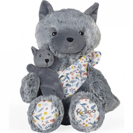 Cette peluche Kaloo avec bébé ré-interprète avec douceur et tendresse les liens inséparables du parent et de son enfant. Maman Louve Louise est une peluche moelleuse en fourrure bi-colore grise toute douce. Elle tient tendrement son louveteau dans un porte-bébé en mousseline de coton avec un bel imprimé "sous-bois".
