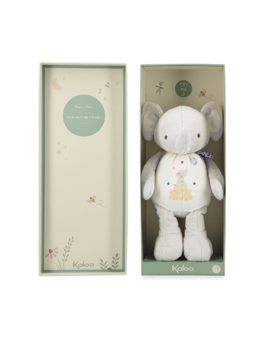 Pour un présent personnalisé, un encart est prévu sous le couvercle du coffret. Cette jolie boîte pourra être facilement réutilisée pour ranger les petites affaires et souvenirs de bébé. Lavable en machine à 30°, cette peluche d’éveil sonore est adaptée dès la naissance.