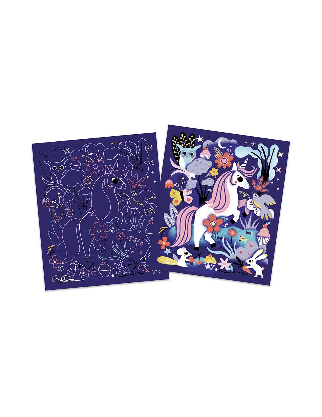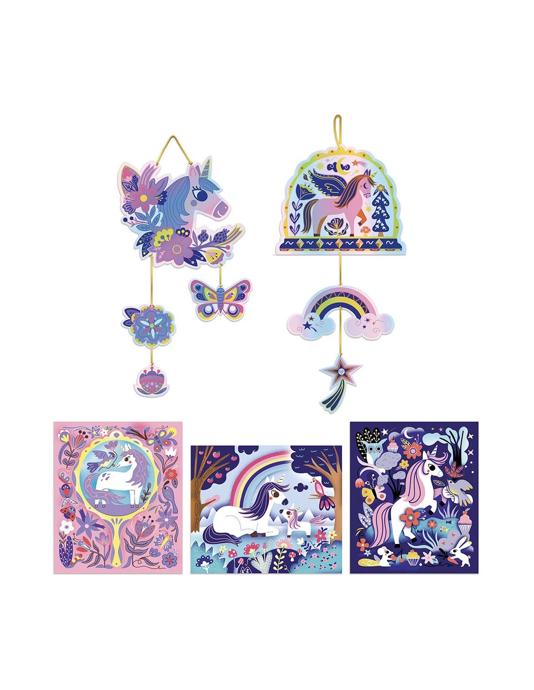 Le kit comprend 3 tableaux imprimés en couleurs, mais aussi deux attrape-soleil prédécoupés. Ces suspensions, conçues sur un support Pet transparent, dévoilent des reflets irisés et holographiques au fur et à mesure que l'enfant gratte l'encre. Petit à petit, l’enfant découvre l'univers de ces créatures magiques : friandises, fleurs ou encore animaux de la forêt !