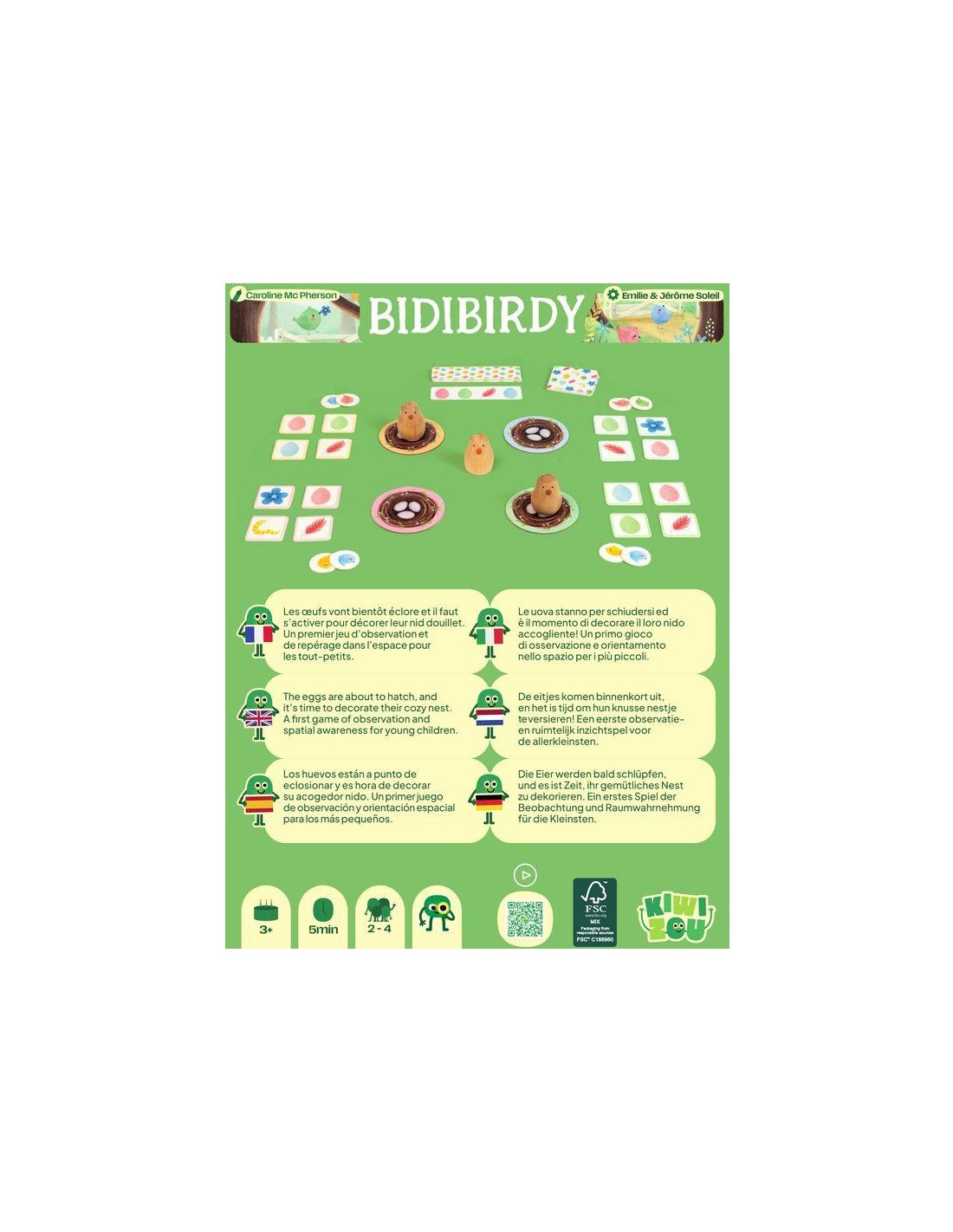 Contenu : 4 plateaux nids, 4 sets de 4 tuiles « décoration » recto / verso, 16 cartes « défi » de niveau 1, 16 cartes « défi » de niveau 2, 3 figurines oiseaux, 20 jetons « bébé oiseau ».,