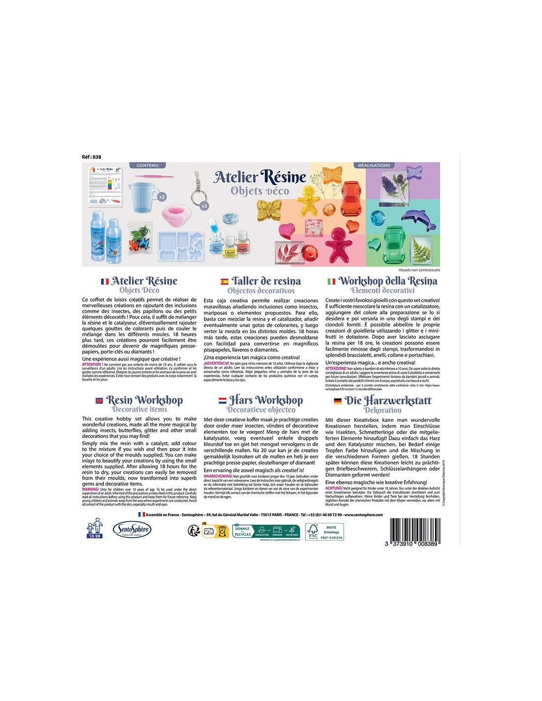 Ce coffret créatif permet de réaliser de merveilleuses créations en rajoutant des inclusions comme des insectes, des papillons ou des paillettes iridescentes ! Pour cela, il suffit de mélanger la résine et le catalyseur, d’éventuellement rajouter quelques gouttes de colorants puis de couler le mélange dans les différents moules. 20 heures plus tard, ces créations pourront facilement être démoulées pour devenir de magnifique presse-papiers, porte clef ou diamant ! Une expérience aussi magique que créative qui a pour seule limite l'imagination !