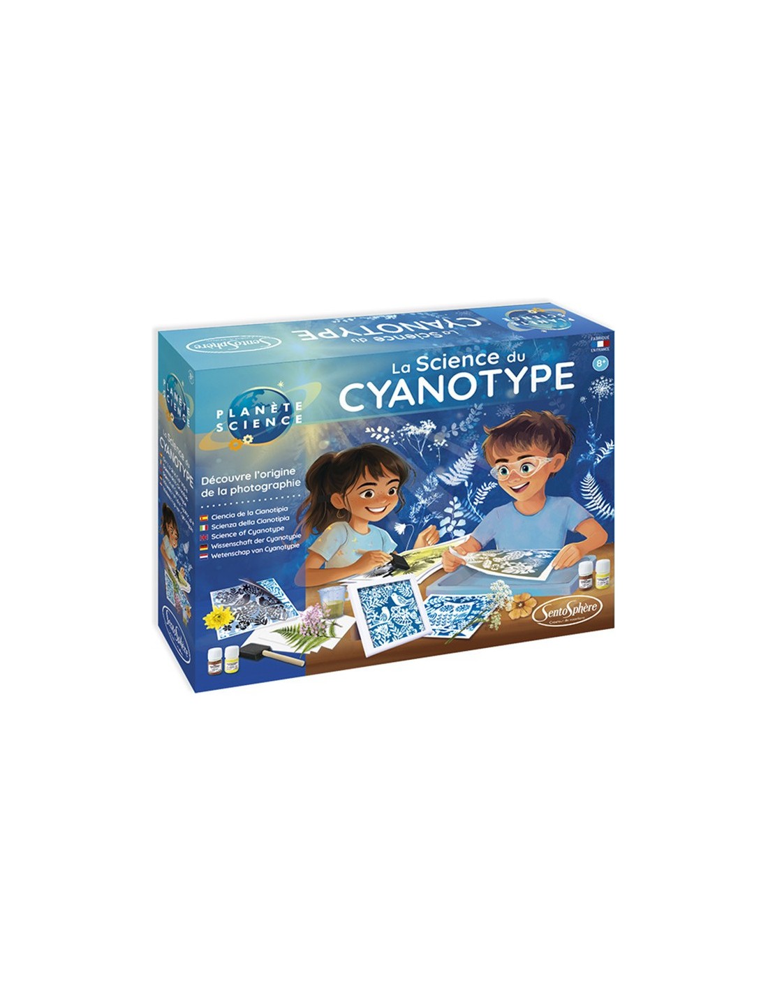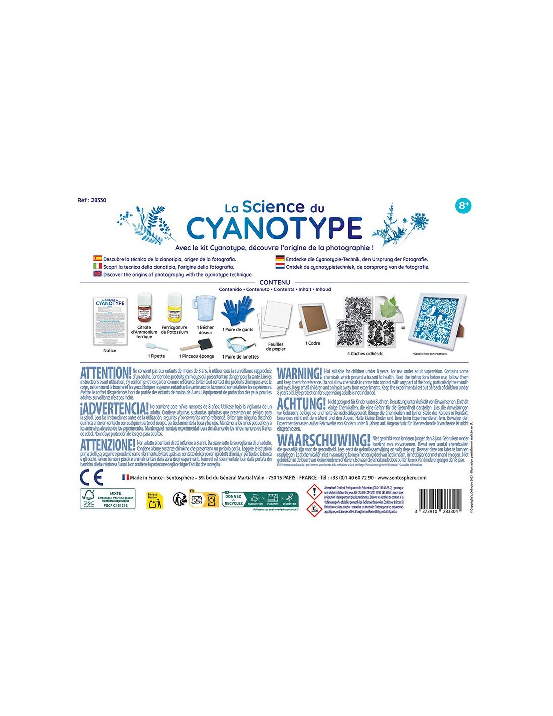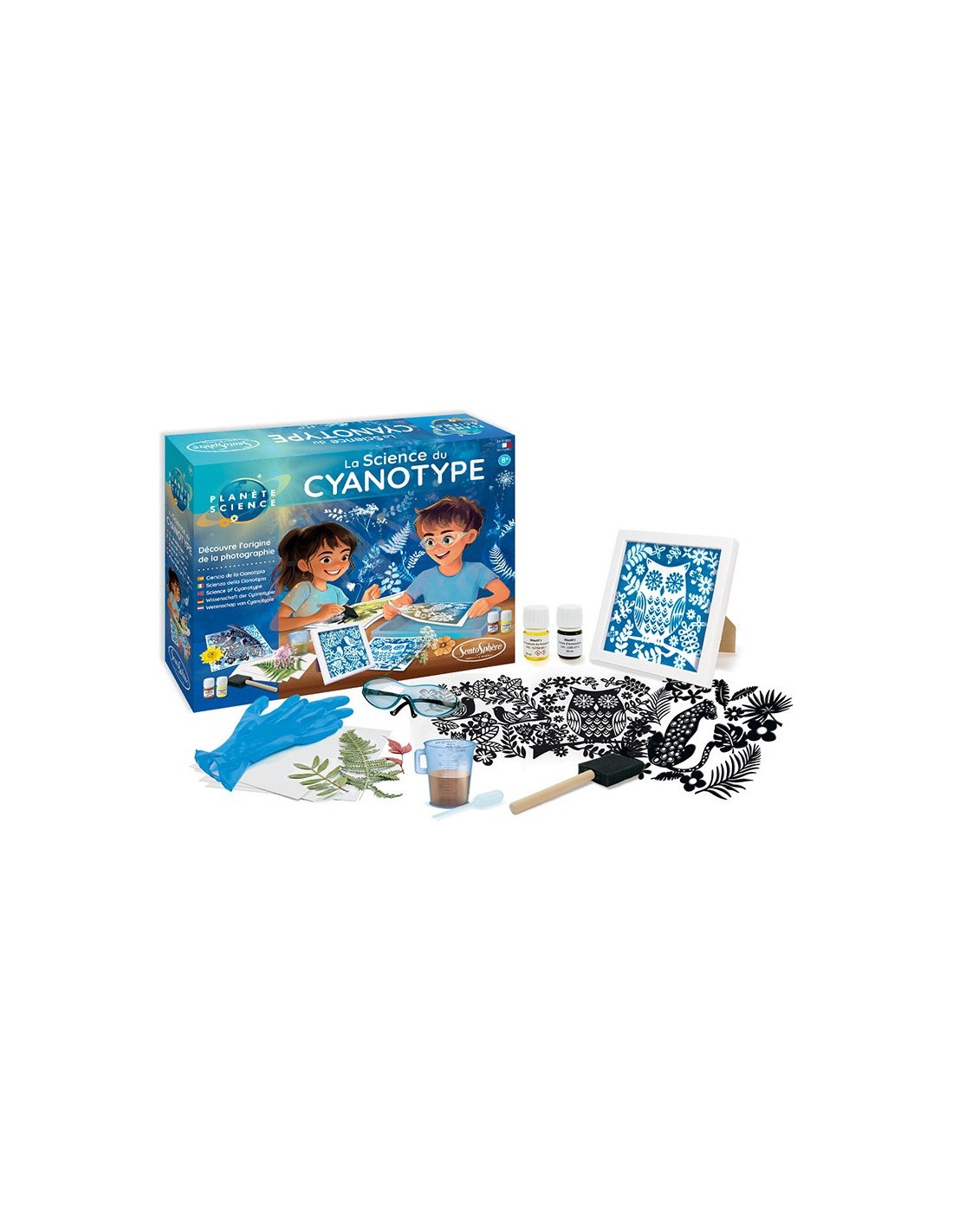 Ce procédé photographique se réalise avec un mélange qui réagit à la lumière et fait apparaître les zones exposées en bleu de Prusse. Tu peux utiliser les pochoirs adhésifs fournis pour tes créations, ou créer de jolis tableaux avec des fleurs et des feuilles séchées. Le cadre fourni te permettra d'exposer ta plus belle réalisation !