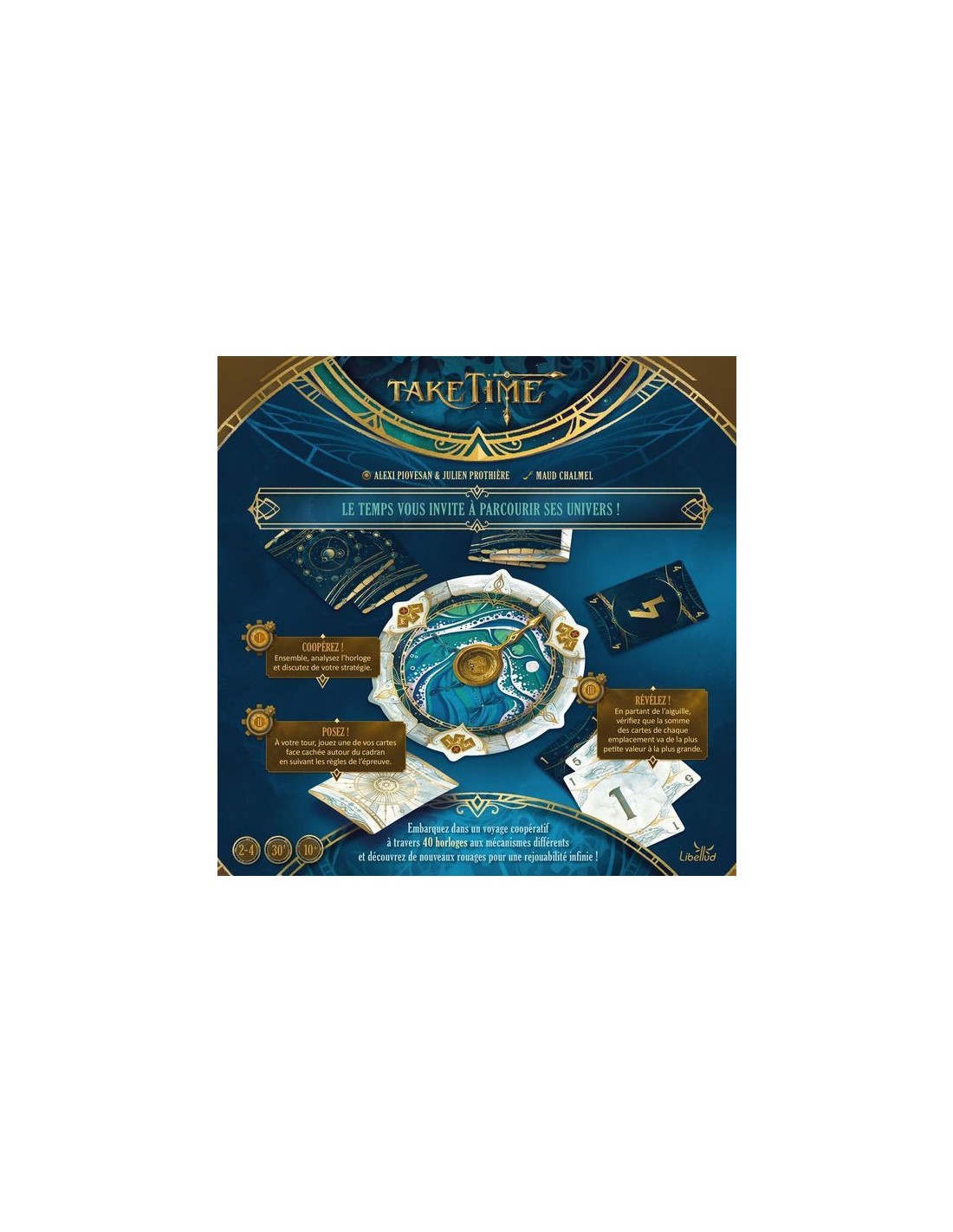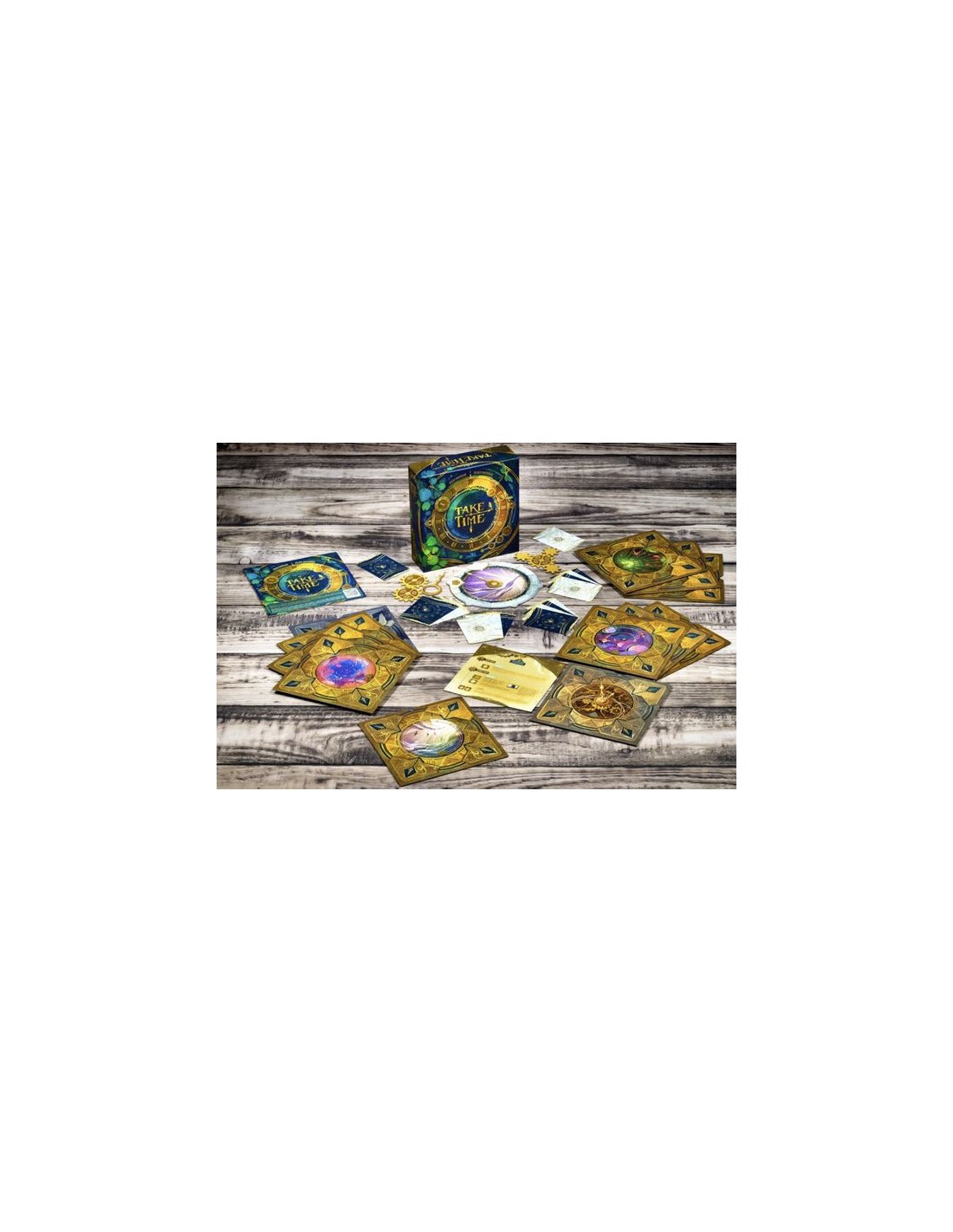 Prenez part à une aventure coopérative unique où chaque seconde compte. Dans Take Time, vous affrontez 40 horloges énigmatiques en équipe. Ouvrez l’une des enveloppes, retournez la première horloge, puis mélangez les 12 cartes Lune et les 12 cartes Soleil (numérotées de même manière) avant de les distribuer entre les joueurs.