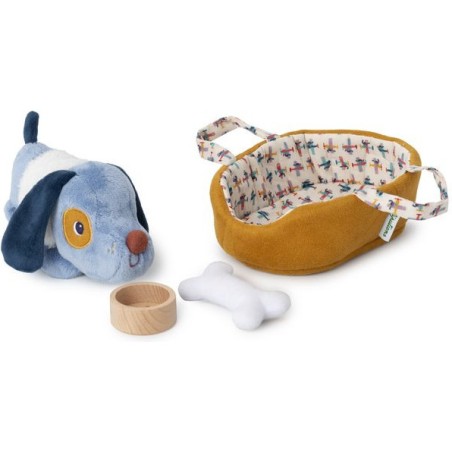 Pour s'amuser et prendre soin de son premier petit chien, votre enfant a tout le nécessaire : un panier réversible avec une face jaune et une face à motifs, un os en tissu, une gamelle en bois avec un imprimé os au fond et une veste amovible. Soit 4 accessoires pour nourrir son chien en peluche, le faire jouer ou dormir tranquillement dans son panier.