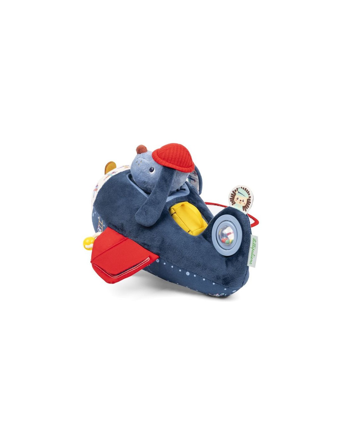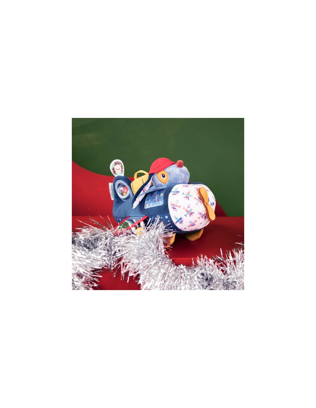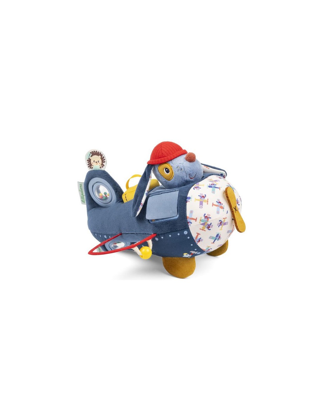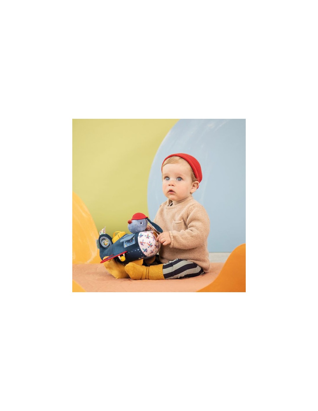 Décollage imminant ! Ce jouet d’activités en forme d’avion et sa petite peluche chien n’ont pas finit de surprendre bébé, à partir de 9 mois. Car quand on est un grand aviateur, et un grand bricoleur, on construit forcément son propre avion ! N’est-ce pas, Jules ? Notre joyeux pilote et son avion en tissu proposent plein d’activités : des volets à soulever, un hochet à billes à faire tournoyer, un petit miroir pour s’observer, un bagage à encastrer encore et encore … Mais aussi des étiquettes amusantes à toucher, et surtout, une petite peluche chien amovible ! Grâce aux différents sons, textures et manipulations, ce jouet d’éveil stimule les sens et la motricité des plus petits. En famille, prenez plaisir à observer toutes les broderies et motifs de cet avion jouet : chaque détail a été pensé pour stimuler l’imagination et attiser la curiosité de bébé. Avec Jules et son avion Lilliputiens, votre bout de chou s’envole pour les tropiques, les plaines enneigées, ou mieux encore : le pays des rêves ! Notre cher Jules a toujours de quoi s’occuper, entre les turbulences qui font chavirer sa valise, la maintenance rigoureuse de l’avion et son copain Léon le hérisson qui joue les passagers clandestins … Cela ne l’empêche pas d’apprécier le voyage, les oreilles au vent, au travers de votre maison ! Encore plus original qu’un cube d’activités, ce jouet premier âge sera d’une grande aide si vous prévoyez votre premier voyage en avion avec votre enfant. Grâce à son côté doux et ludique, il rassure et encourage la curiosité, pour grandir et s’épanouir en bonne compagnie. Dans son format 26 x 26 x 17 cm, ce jouet d’activités en tissu est lavable en surface. Alors, quelle sera votre prochaine destination ?