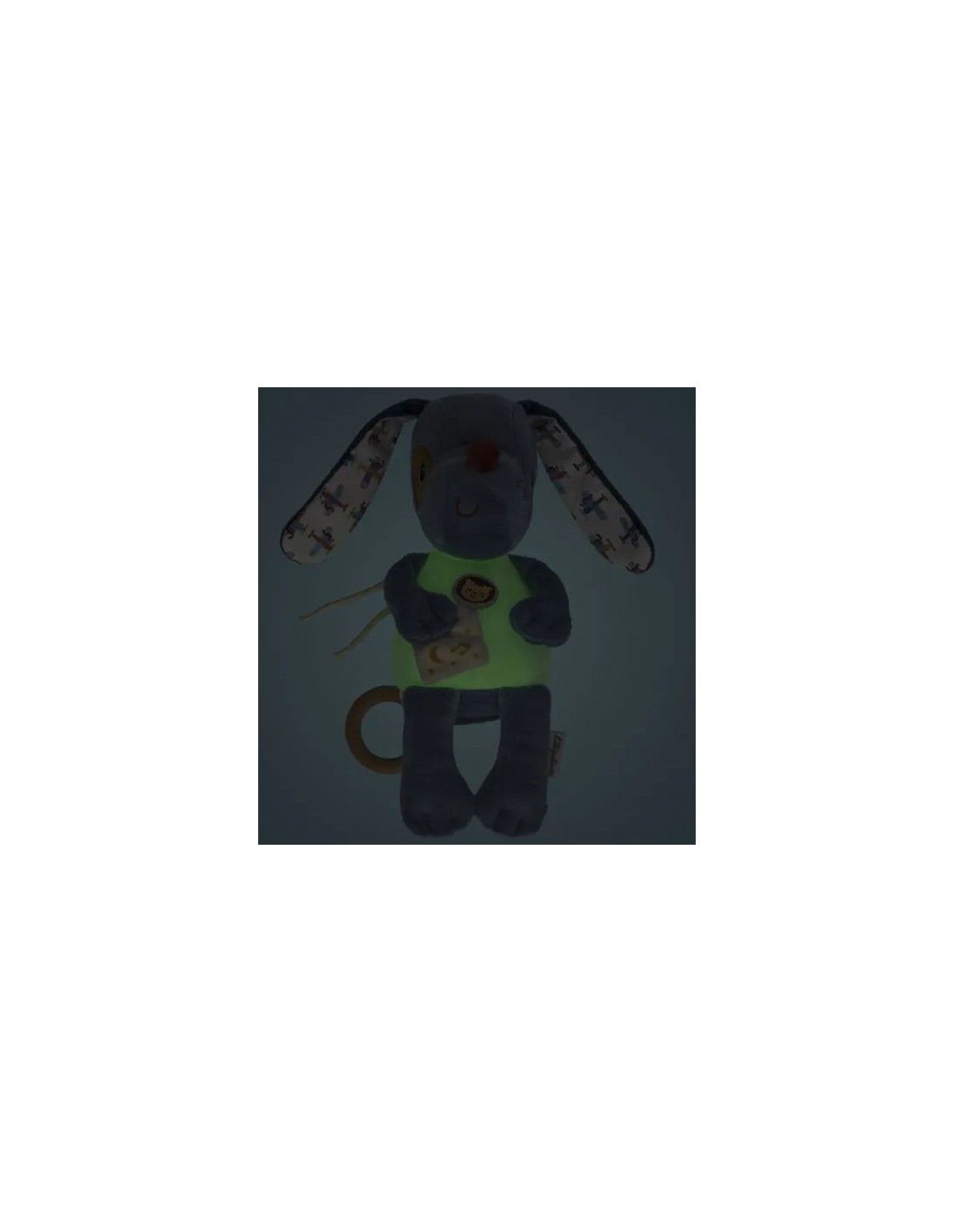 Avec son pelage ultra-doux, ses teintes bleues et sa frimousse super craquante, cette peluche phosphorescente est bien plus qu’un jouet musical : c’est aussi un compagnon de câlins ! Ses grandes oreilles sont décorées de motifs colorés inspirés des aventures de Jules dans son avion, pour éveiller la curiosité des tout-petits.