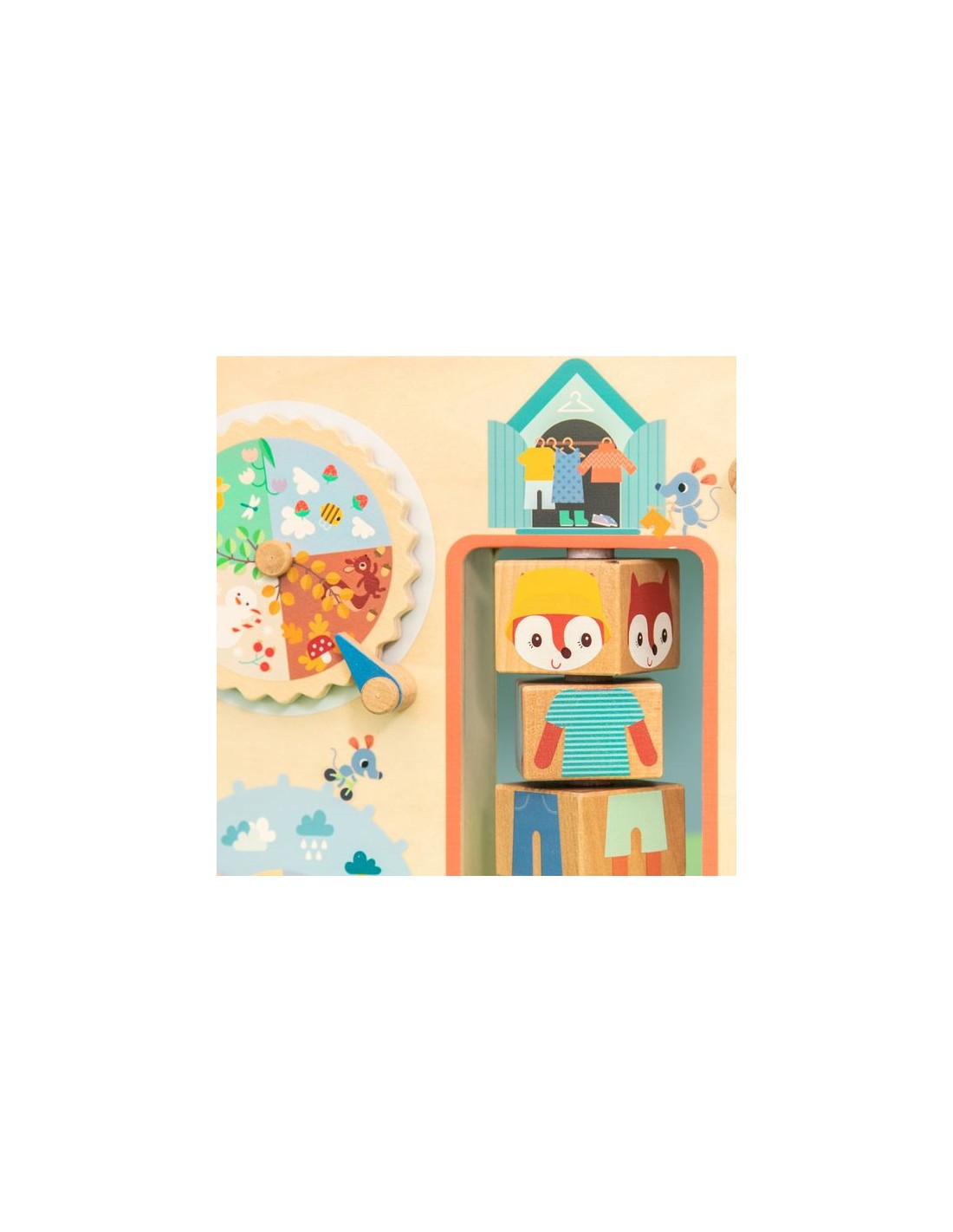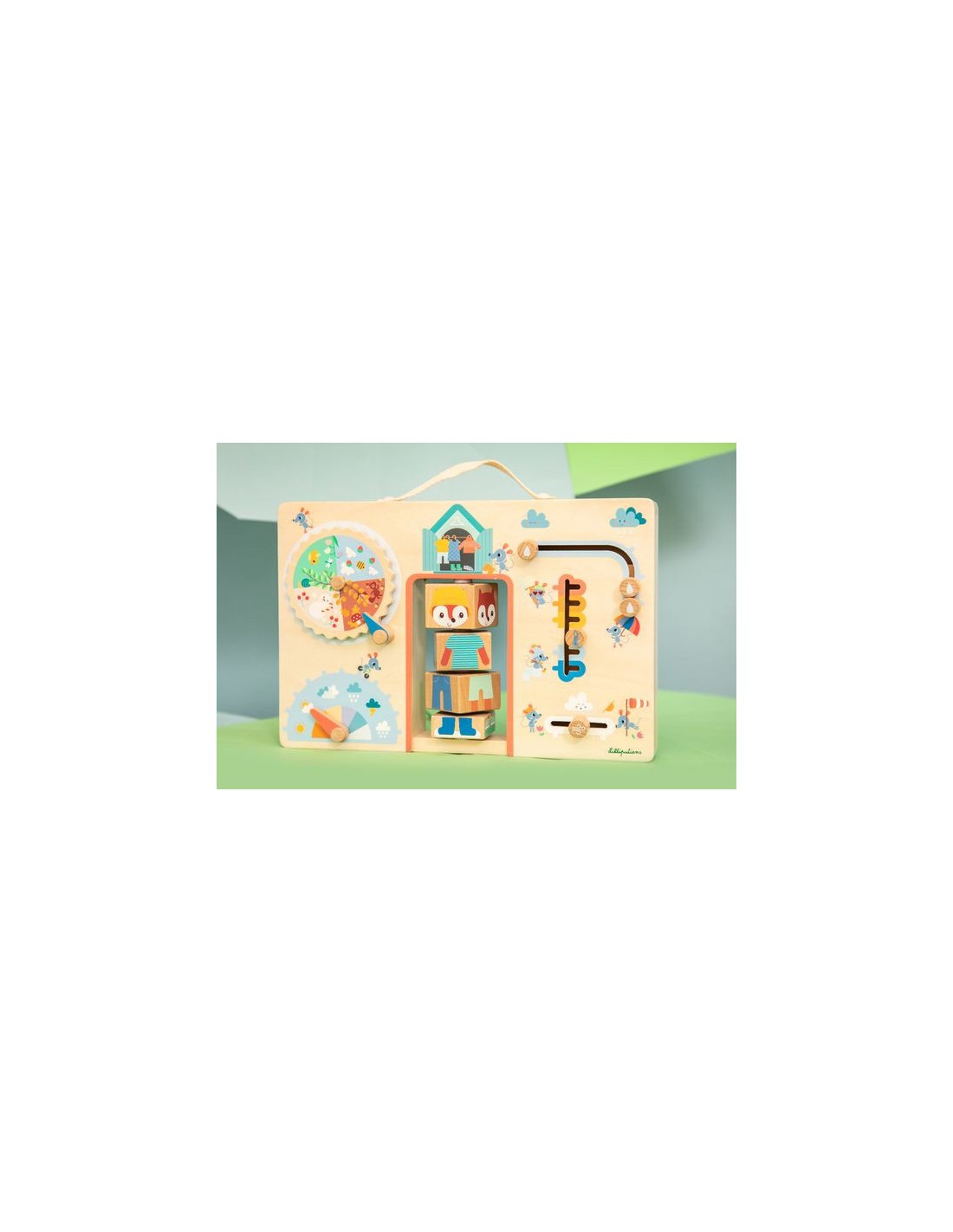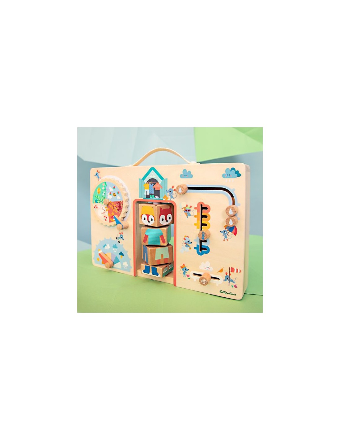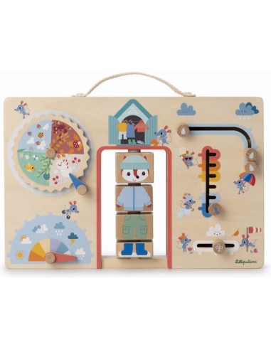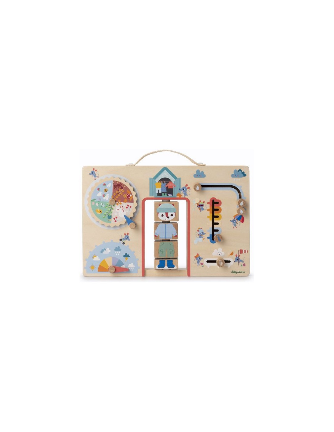 S'habiller selon la météo, ça s'apprend ! Dès l'âge de 2 ans, les enfants profitent d'une jolie valisette en bois pour mieux comprendre les saisons et gagner en autonomie. Dans ce jeu éducatif, retrouvez Alice la renarde et ses copines les souris, prêtes à l'aider à identifier les conditions météo du jour pour choisir la tenue idéale. Grâce aux 6 activités à manipuler présentes sur la mallette, votre enfant découvre par la manipulation tout en développant sa motricité fine. C'est idéal pour rendre l'abstrait plus concret pour les petits, et surtout faciliter les décisions au moment de s'habiller ! Cette valisette en bois est le support où les petits indiquent leurs observations du temps qu'il fait : une véritable routine quotidienne pour votre famille. Votre enfant fait d'abord tourner la mollette des saisons, puis place l'aiguille pour indiquer le temps qu'il fait aujourd'hui, au choix : ensoleillé, partiellement nuageux, couvert, averses de pluie, orages ou averses de neige. S'il pleut, votre enfant peut indiquer l'intensité de la pluie en faisant coulisser 3 petites gouttes sur le parapluie de notre souris bien équipée. Même chose pour le vent : de la simple petite brise aux vents plus forts, il fait glisser une pièce en bois de gauche à droite. Ensuite, très important pour s'habiller en conséquence : la température, bien-sûr ! Du gel hivernal aux chaudes journées d'été, votre enfant place le curseur selon le ressenti ou les prévisions du jour. Il ne reste plus qu'à entrer dans l'armoire d'Alice pour trouver les bons vêtements pour la journée. Grâce aux 4 blocs à faire tourner, habillez notre renarde de la tête aux pieds. Et voilà, votre bambin n'a plus qu’à faire de même ! Le petit plus de ce jeu éducatif Lilliputiens, c'est la poignée en tissu très pratique pour que votre enfant manipule la valisette à sa guise. Format 31x20 cm, lavable en surface uniquement.