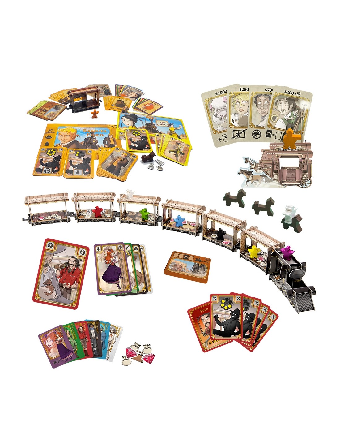 Cette extension de Colt Express apporte son lot de nouveautés ! Un deuxième train 3D avec des wagons spéciaux, 2 nouveaux bandits leurs nouveaux pouvoirs, un double mode par équipe avec ou sans trahison, et un Bandit Ia pour vous permettre de jouer même lorsque vous êtes en nombre impair. Mais surtout, elle apporte une super dose de fun ! Rire assuré. Le jeu en équipe Le nouvelle action Coup de pouceMaintenant que vous avez des coéquipiers, vous allez surement avoir envie de les aider à un moment donné. C’est à ce moment-là que vous jouerez la carte Coup de pouce. Choisissez une des actions de base (déplacement, changement d’étage, tir, coup de poing ou braquage) et offrez-la à votre Bandit préféré qui décide de la réaliser – ou pas – de la manière qu’il veut !