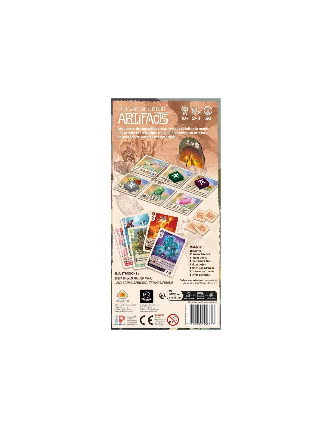 Contenu : 28 Cartes, 11 tuiles Artefact, 4 jetons Choix, 4 marqueurs Abri, 4 aides de jeu, 4 extensions d’arène, 1 caverne cartonnée, 1 Livret de règles