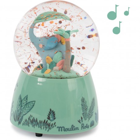 La boule à neige musicale de la collection "Sous mon Baobab" de Moulin Roty, est une jolie boite à musique dans laquelle on peut voir le bel animal de la savane, Bergamote l'éléphant.