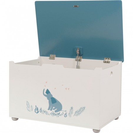 Ce grand coffre en bois peint, aux couleurs de la collection "Sous mon Baobab", est muni d'un vérin de sécurité pour accompagner le mouvement du couvercle, pour préserver les petits doigts.Il tient ouvert tout seul, et le piston permet à un enfant de le manipuler seul très facilement.