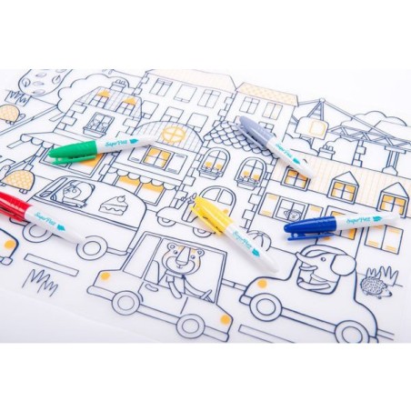 Set de table en silicone à colorier Moulin Roty, de la collection les popipop, issu de la collaboration avec Super Petit ! Partagez un moment ludique en famille autour de repas animés et créatifs… Composé d'un set réutilisable à l'infini et 5 feutres effaçables. 3 ans et +