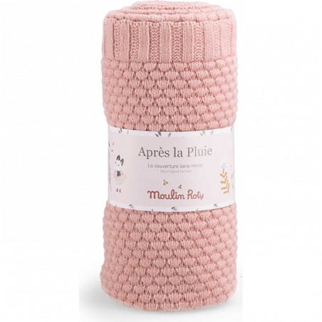 Craquez pour la belle couverture en laine tricotée grise de la collection Après La Pluie de Moulin Roty. En tricot rose, certifiée OEKO-TEX®, c'est un magnifique cadeau de naissance pour bébé, unique et réconfortant.