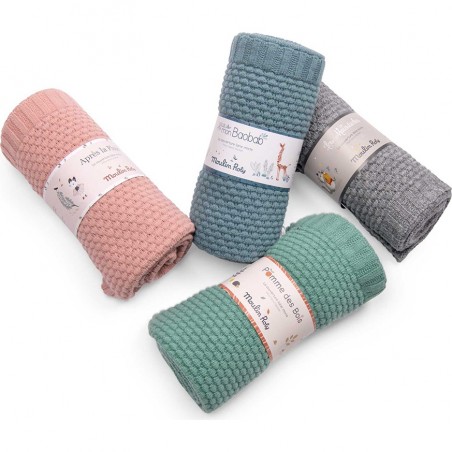 La couverture en laine tricotée se décline également dans d'autres collections emblématiques de la marque : Après la Pluie, Sous mon Baobab et Pomme des Bois.