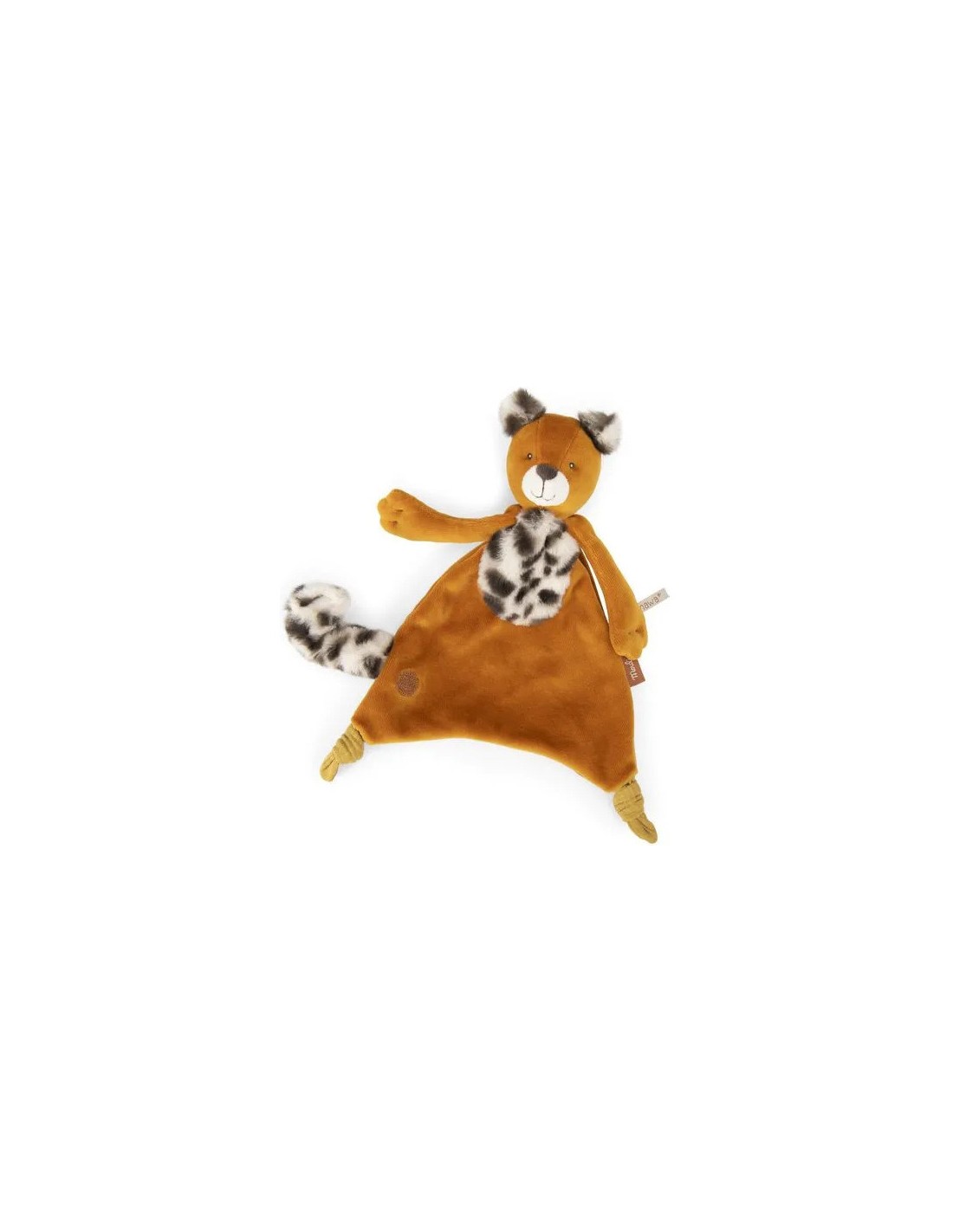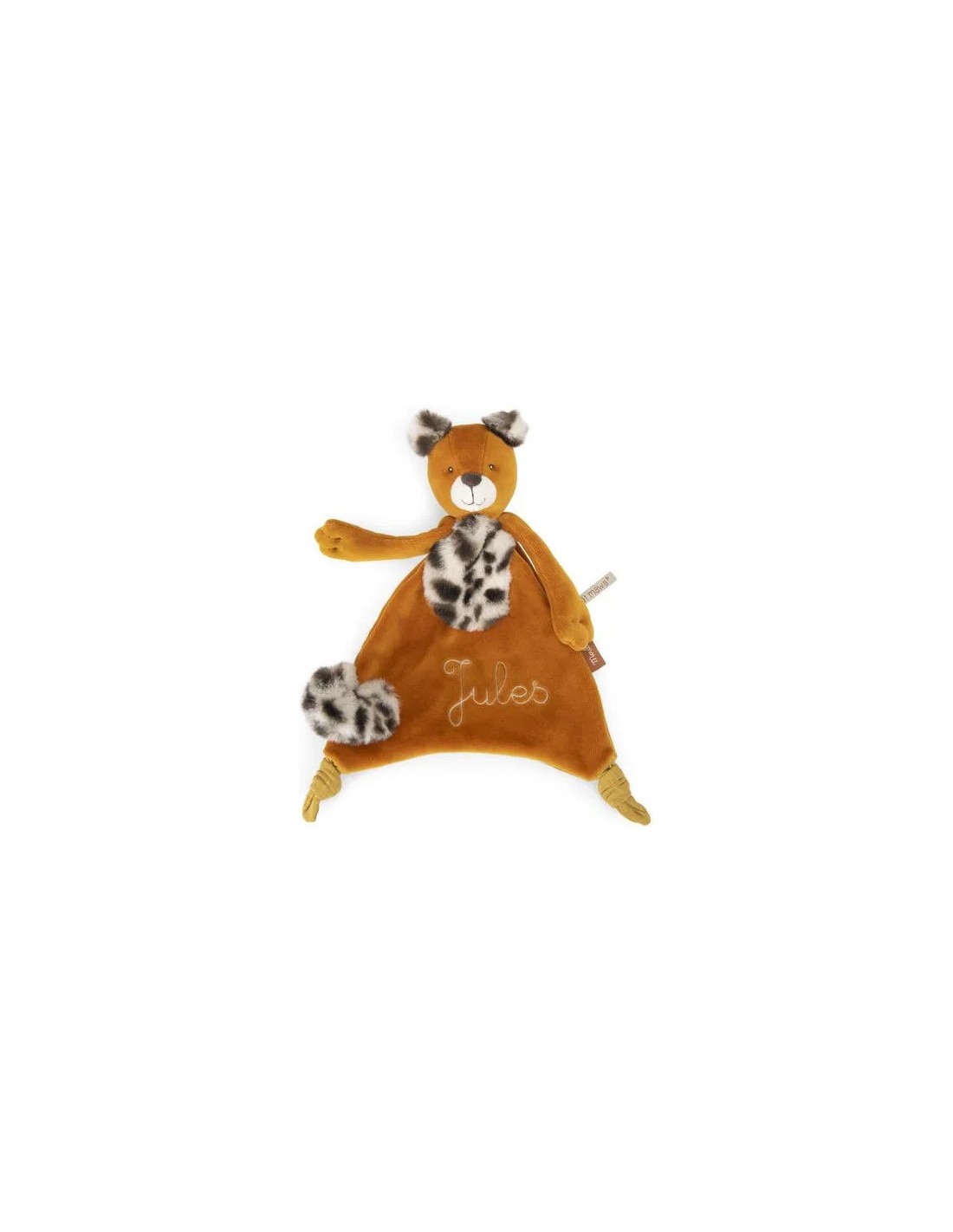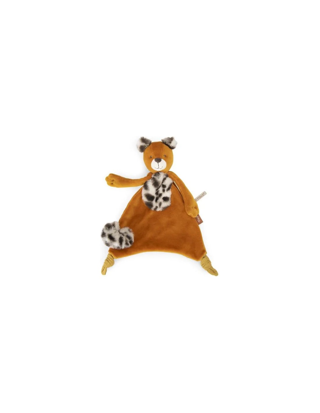 Doudou Taïgo le léopard avec sa fourrure tâchetée et ses grandes pattes. Sa queue se transforme en attache tétine à scratcher sur l'avant. Il sera le compagnon parfait pour surveiller bébé en quête de nuits paisibles. Il peut être brodé au prénom de l'enfant