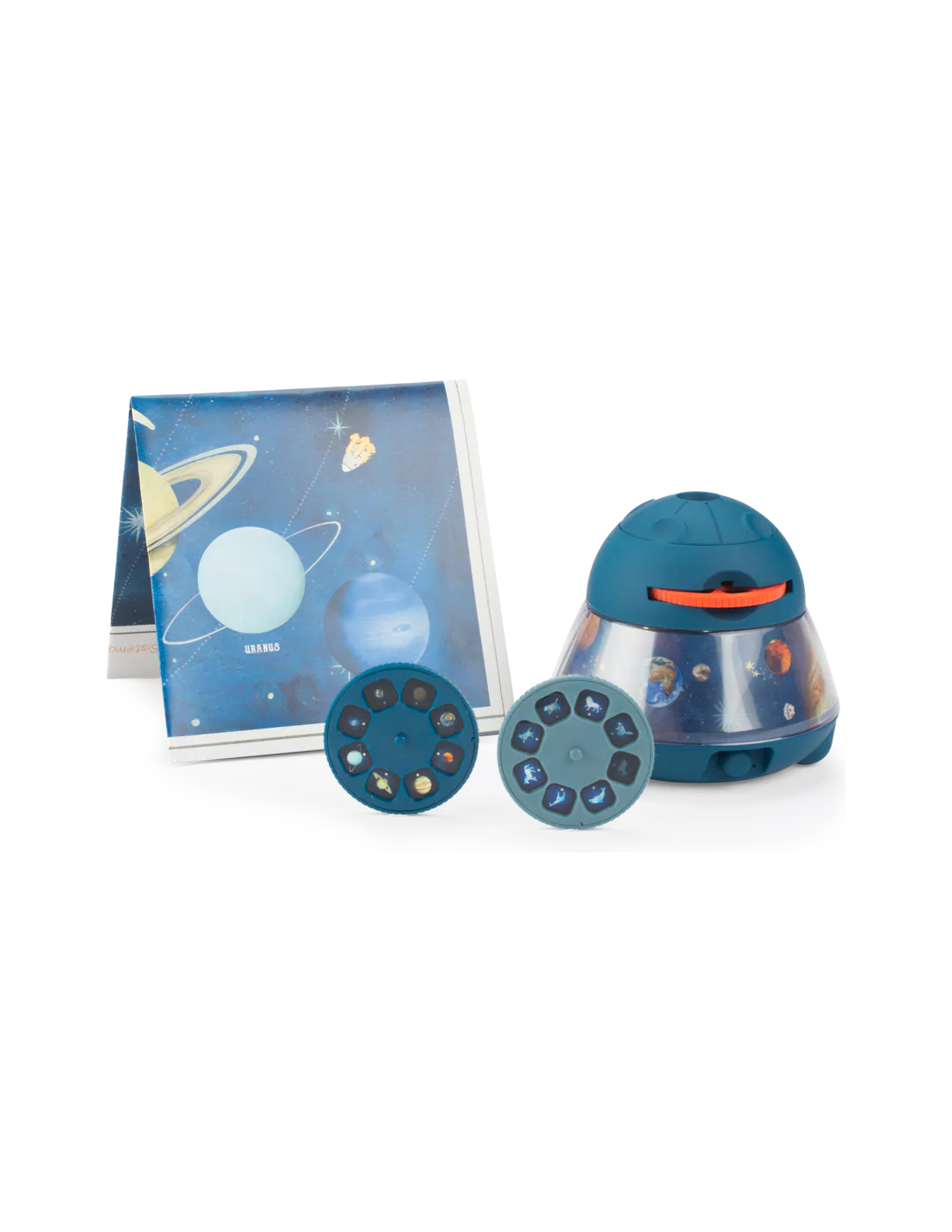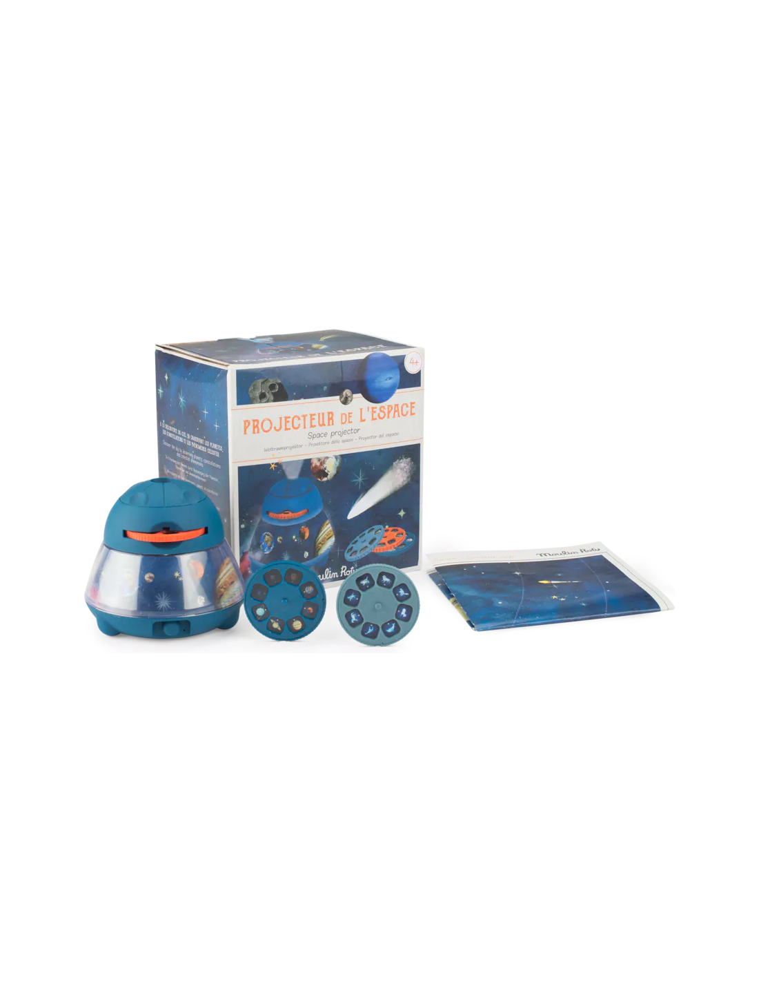 Le grand projecteur de l'espace permet de projeter planètes, constellations et comètes au mur ou au plafond. Avec ses 3 disques de 8 diapositives, l'enfant pourra découvrir le monde spatial ! Il se recharge via Usb. Poster et livret d'instructions inclus.