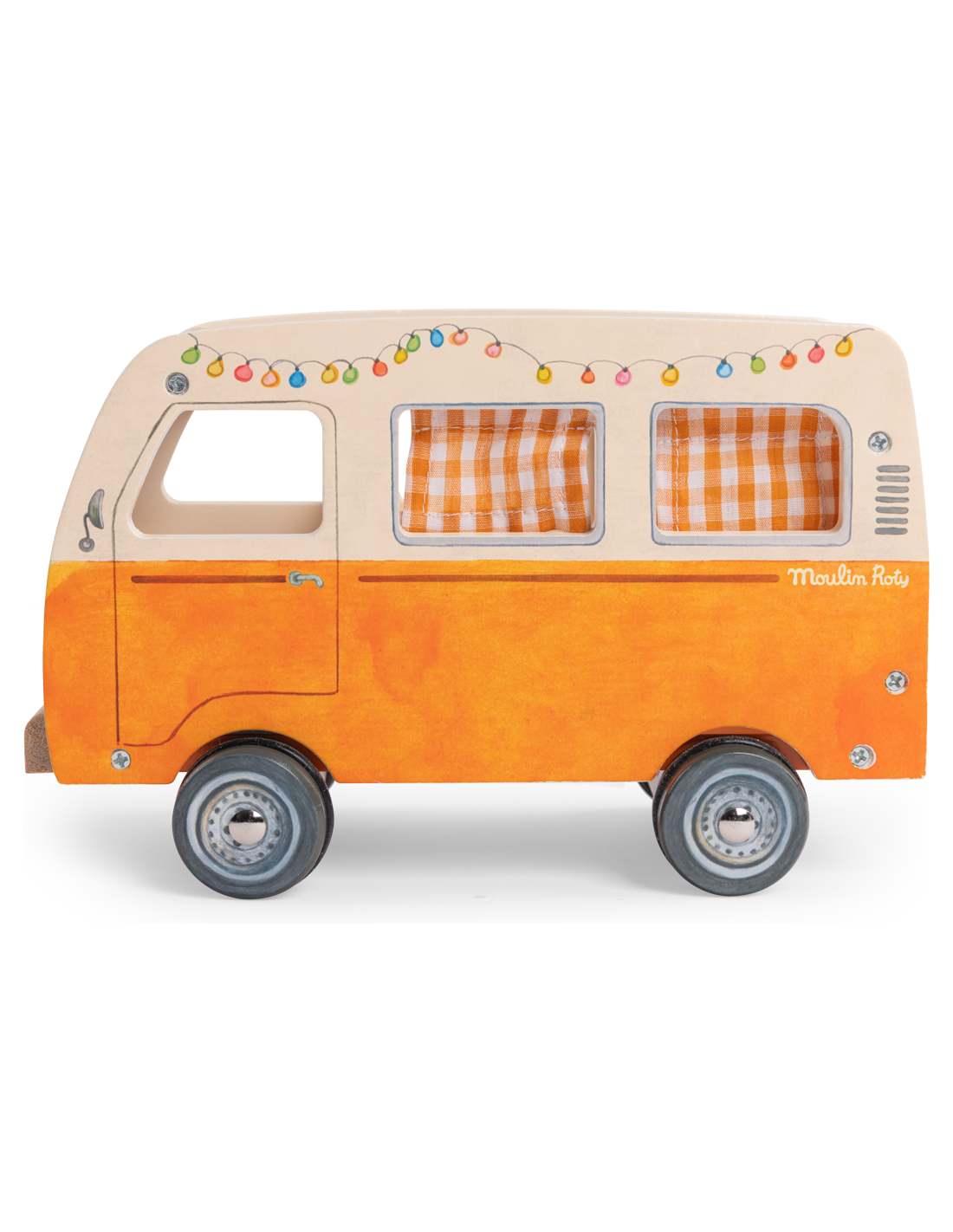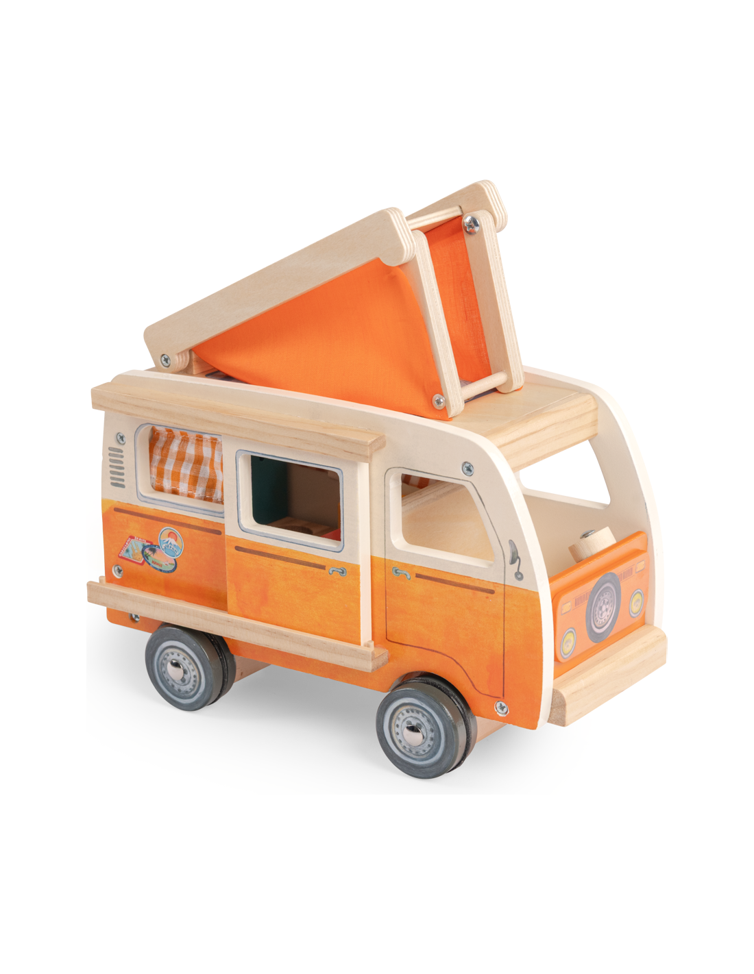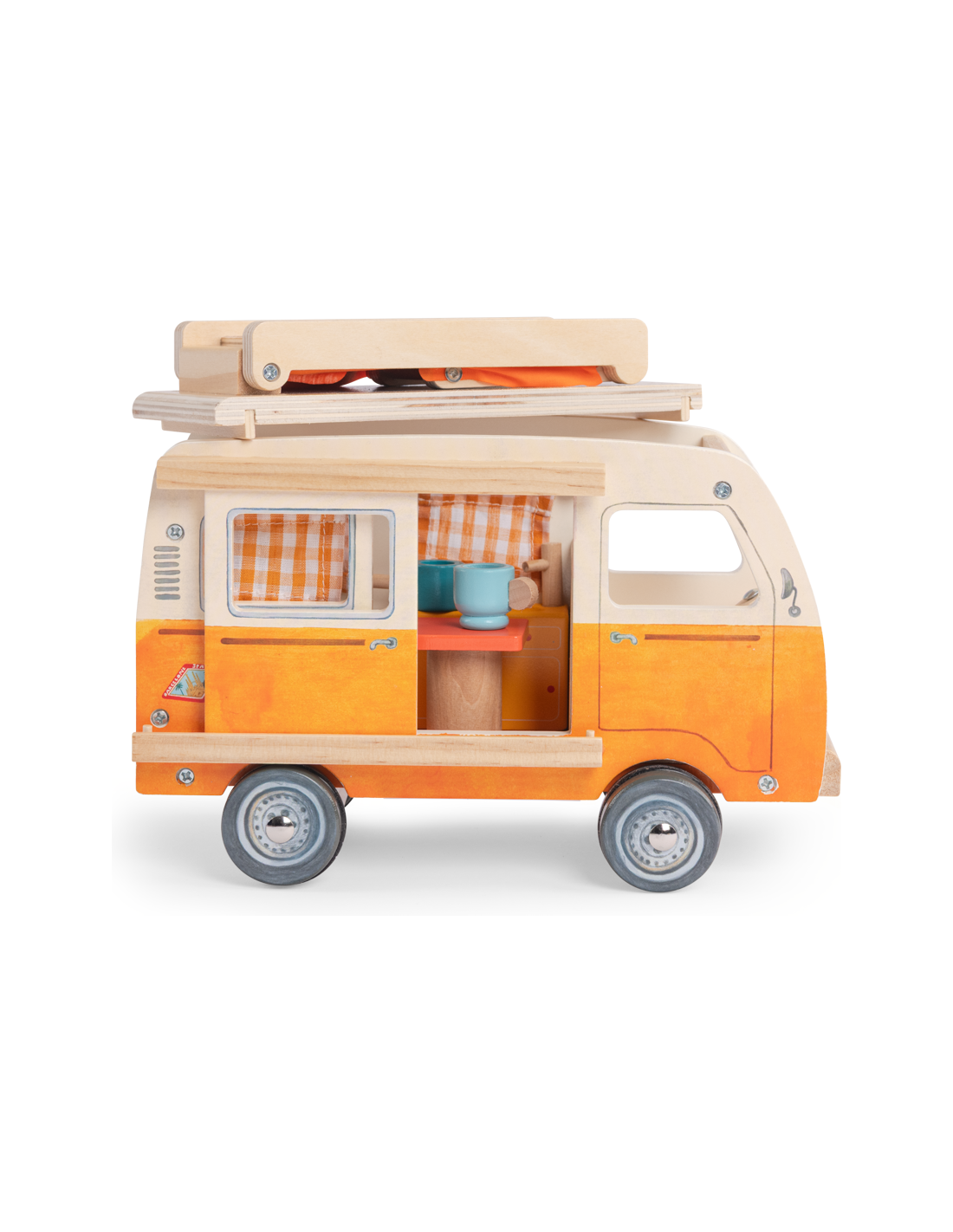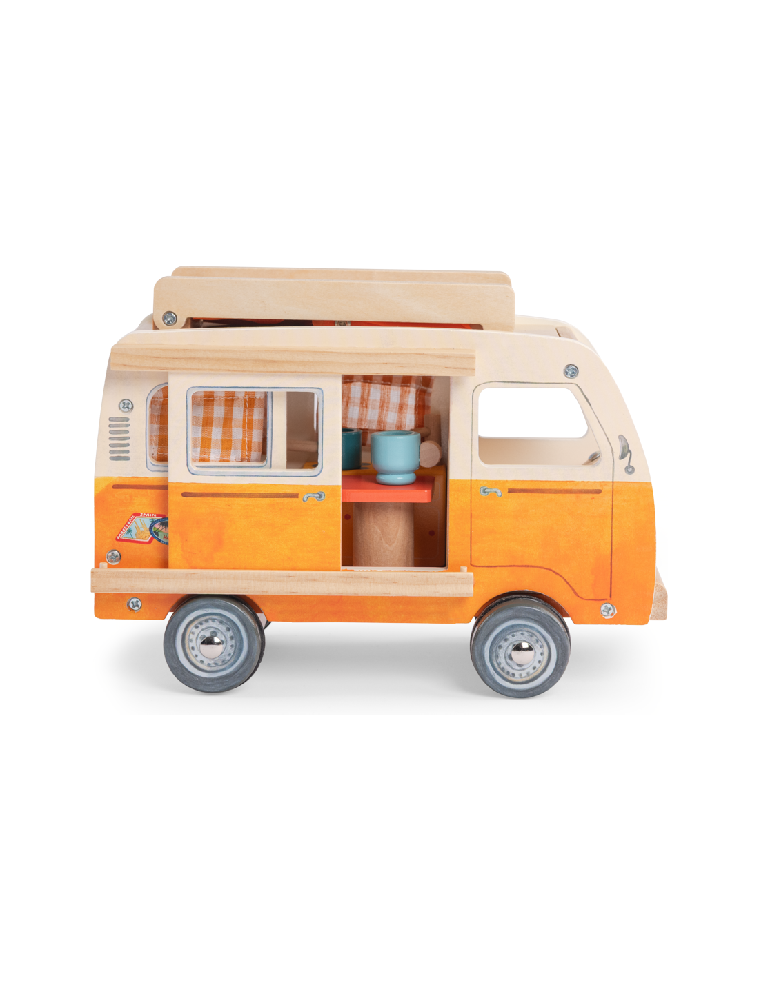Tut tut ! Le van de la Grande Famille est prêt à partir sillonner le monde. Entièrement équipé, il comprend tous les essentiels du camping : table, banquette, ustensiles, tente de toit. Rien de mieux pour se mettre au vert en famille !