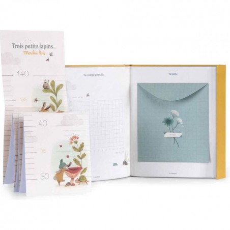 Le livre de naissance de la collection « Trois Petits Lapins » est un coffret naissance qui recueille les meilleurs souvenirs et toutes les premières fois de bébé de sa naissance à 6 ans. L’album de naissance Moulin Roty contient 6 enveloppes à souvenirs et une toise offerte pour voir bébé grandir.