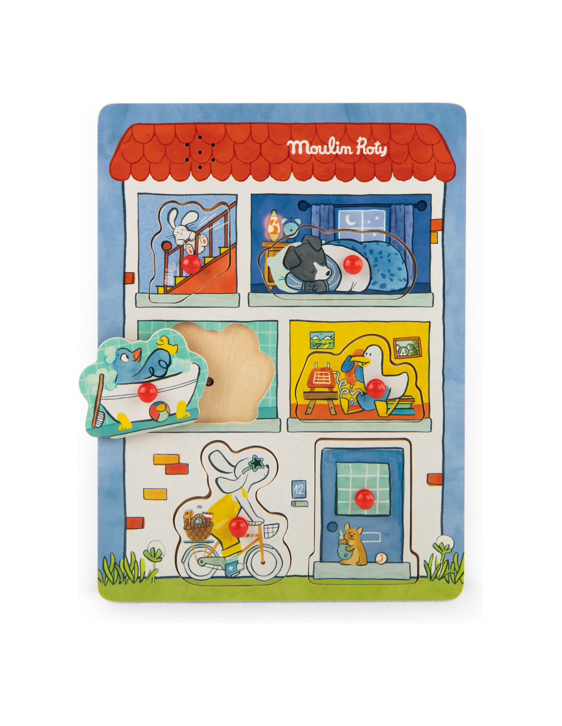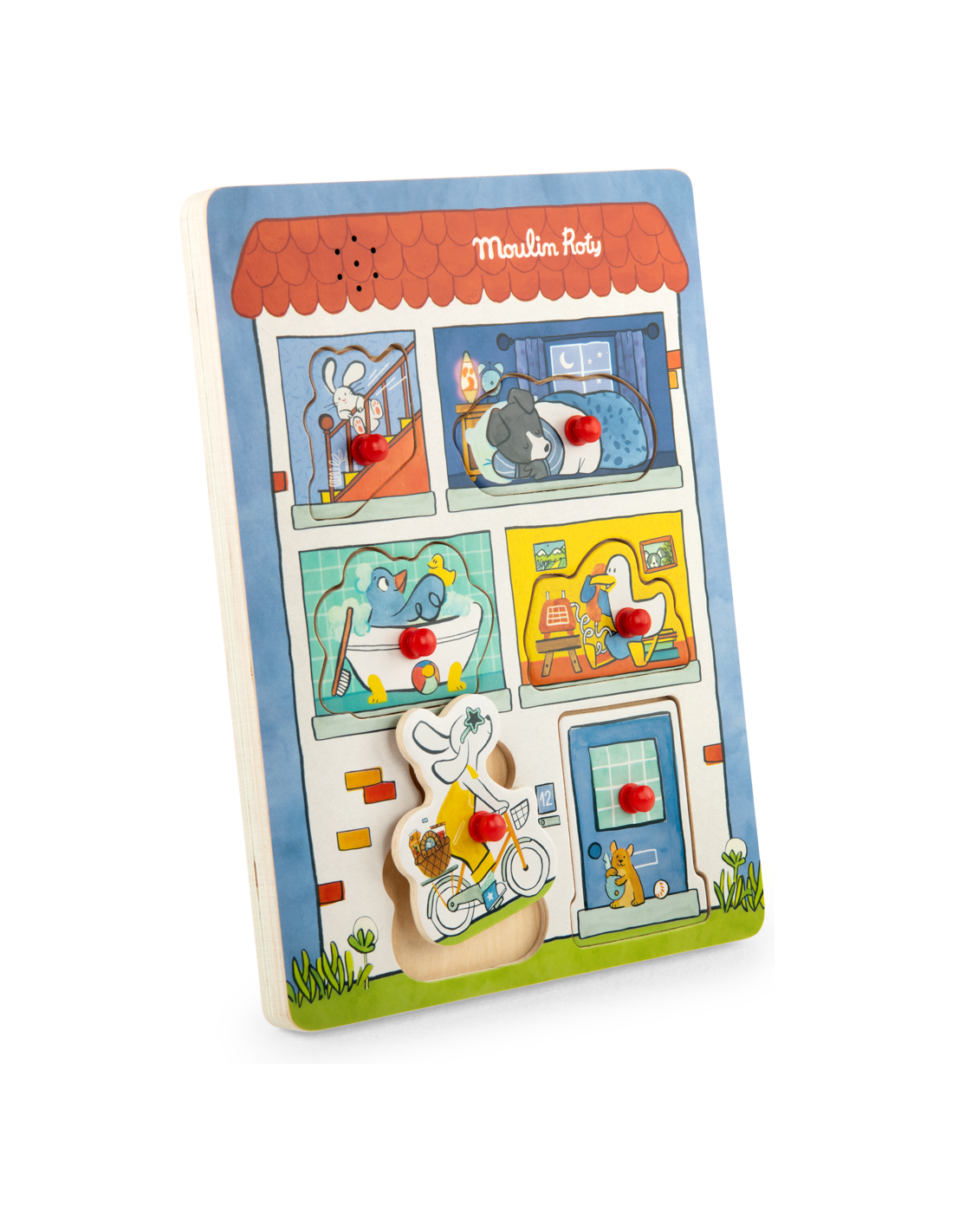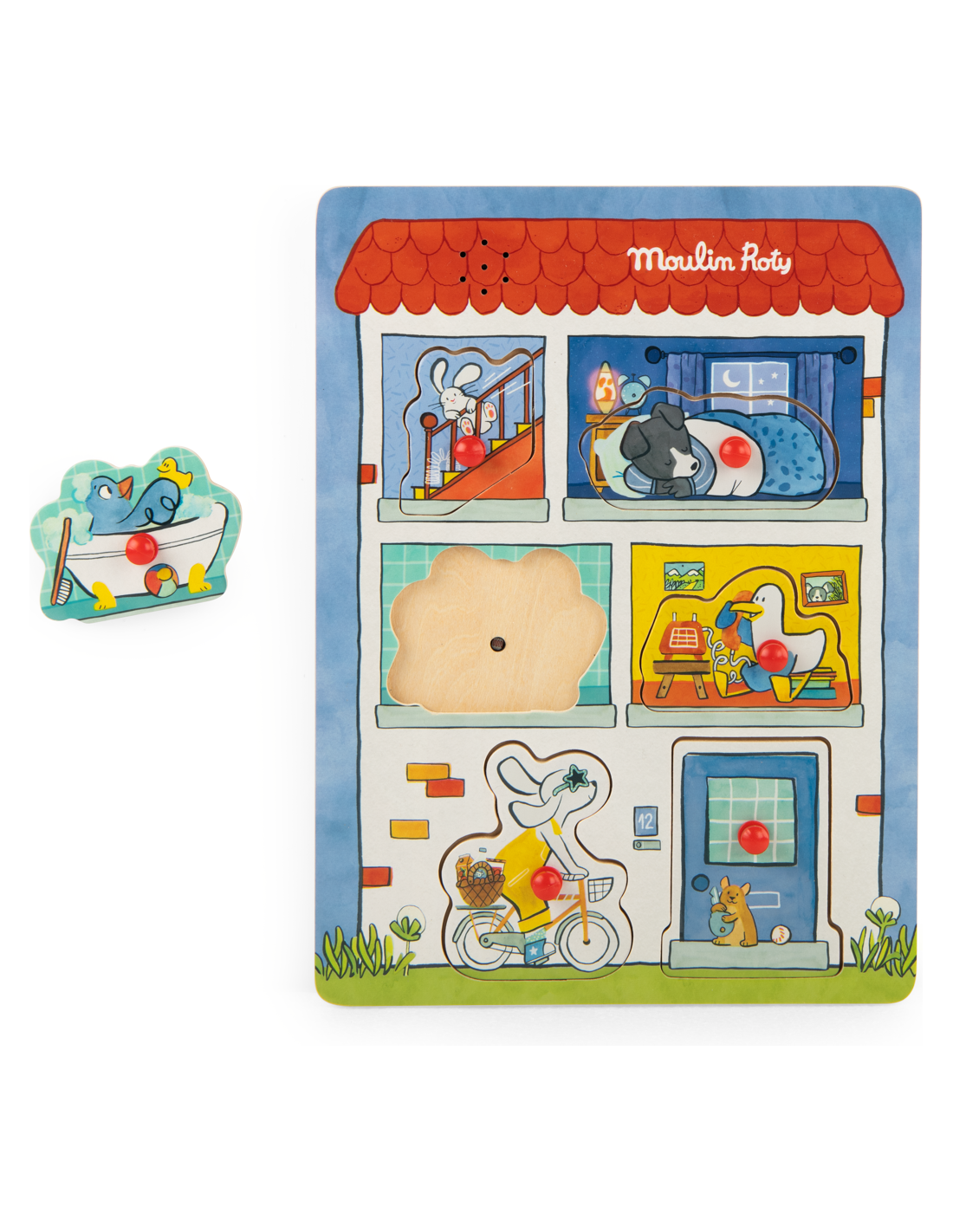 Puzzle sonore pour s'éveiller à la musique de manière ludique. Replace les 6 pièces en bois qui composent la maison de Puce & Pilou en y découvrant les sons du quotidien : sonnette, téléphone... Permet aussi d'appréhender les formes et les couleurs.