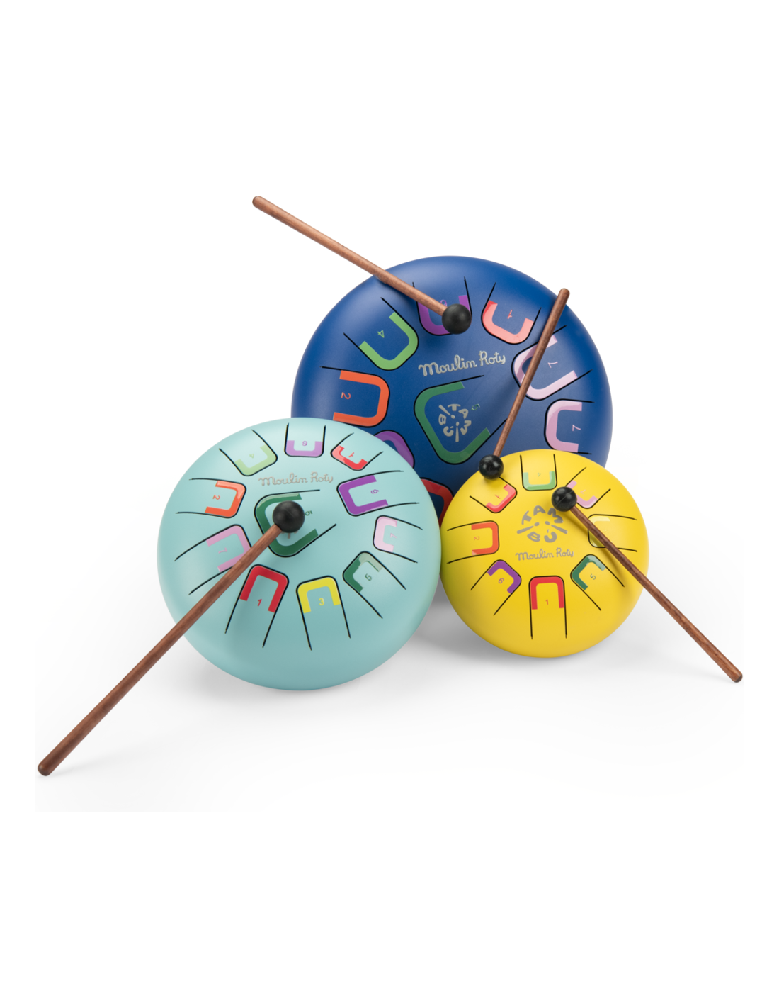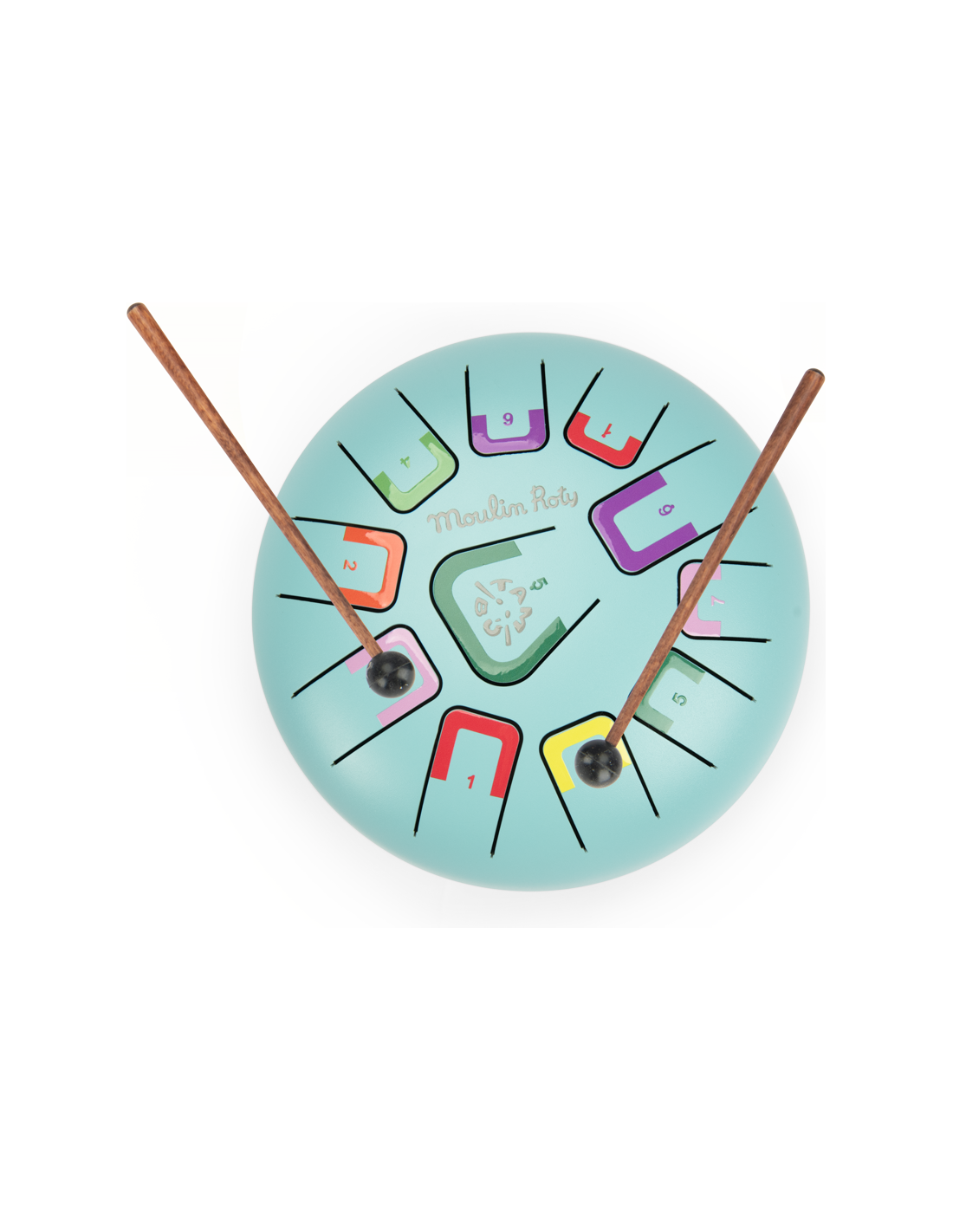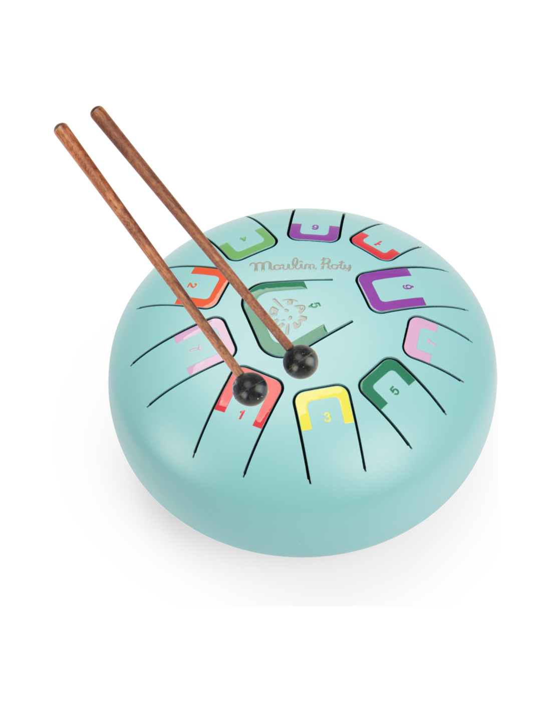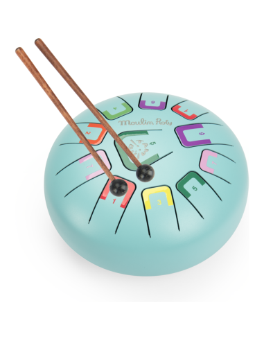 D'un diamètre de 20 cm, le petit tambour à languettes se joue avec les doigts, les mains ou les baguettes fournies. Composé de 11 notes, il est le parfait instrument pour favoriser l'éveil musical. Contient un livret de partitions et un sac en tissu.
