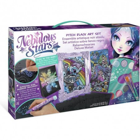 Ce n'est que dans le noir que les étoiles brillent ! Cet ensemble comprend des tableaux noirs d'aquarelle magique qui brillent dans le noir, une palette de peinture aux couleurs métalliques et bien plus. Tout ce qu'il te faut pour créer des œuvres dignes d'un ciel étoilé !
