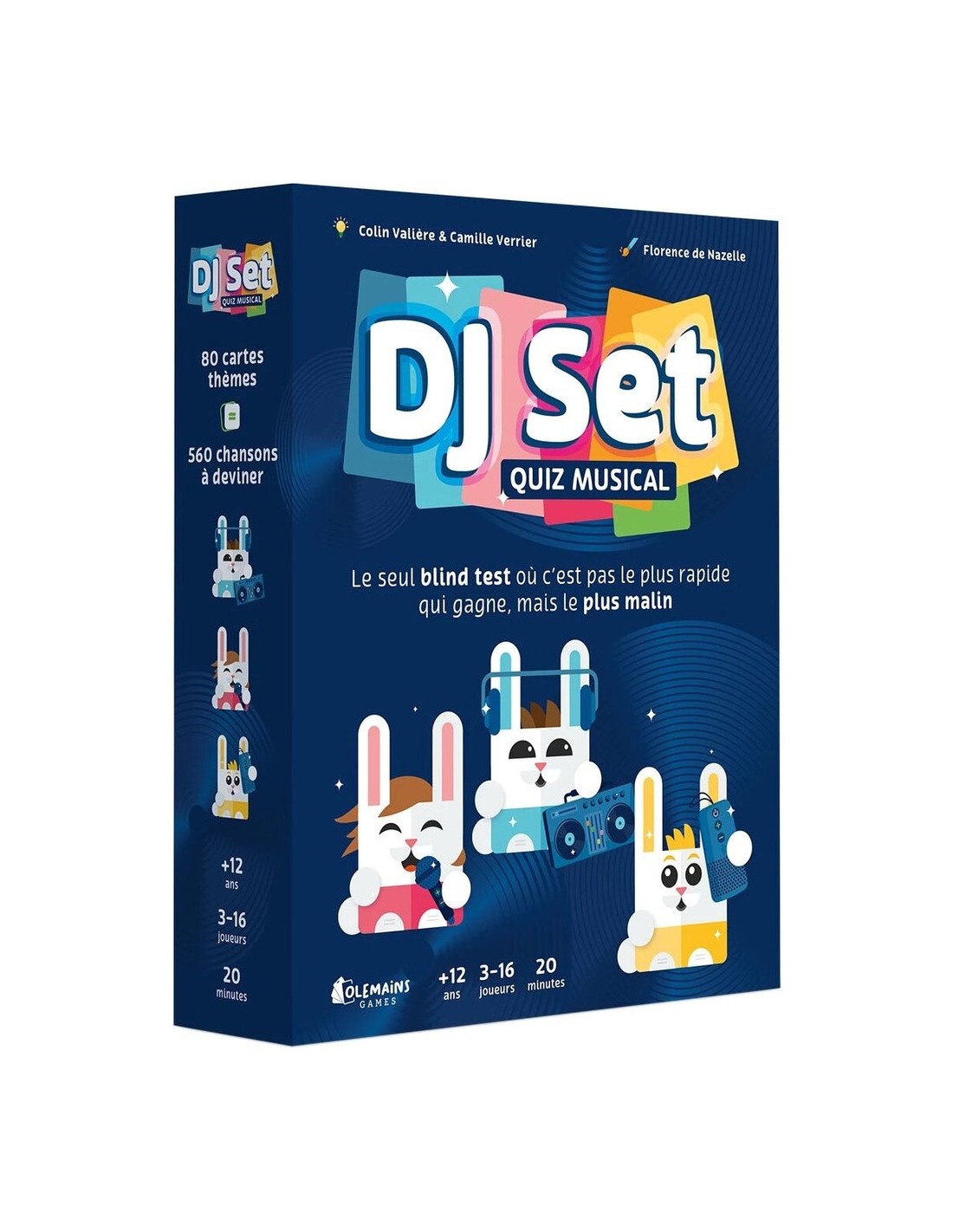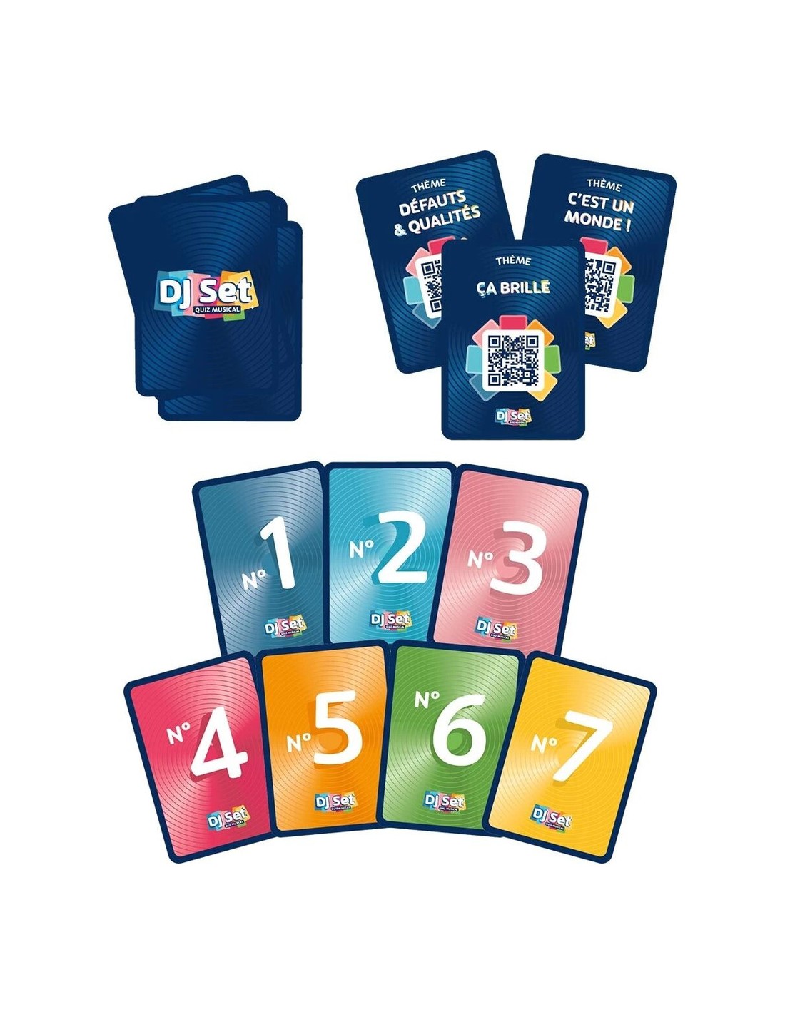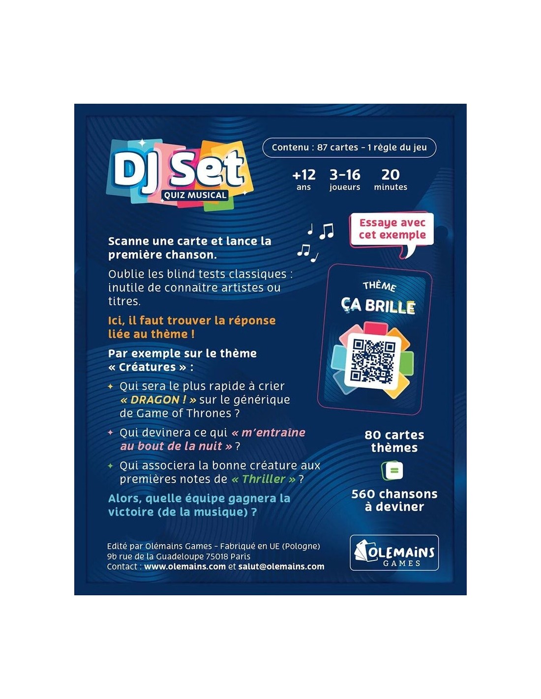 Dans Dj Set, les joueurs scannent un Qr code qui renvoie vers une playlist thématique (par exemple Couleurs). En équipe, les joueurs trouvent la couleur évoquée par la musique, que ce soit dans les paroles (Paradis Blanc), le titre (Blue), le groupe (P! nk), ou le thème de la musique (les Simpsons). À chaque tour, la personne qui a trouvé fait gagner un point à son équipe et devient Dj.