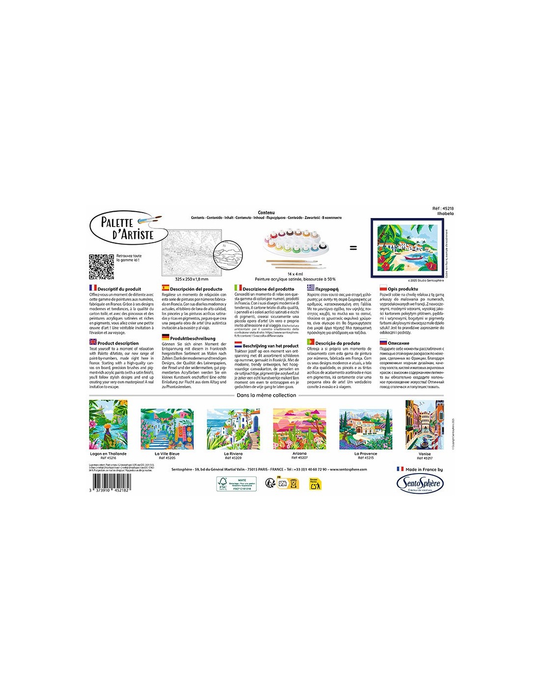 Chaque coffret contient deux ou trois pinceaux adaptés au format du tableau, ainsi qu’une palette de 13 à 17 couleurs acryliques soigneusement sélectionnées. Vous apprécierez leur texture fluide et leur fini satiné pour un rendu impeccable et parfaitement couvrant.