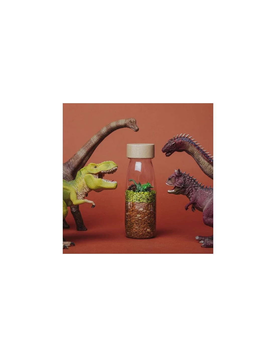 Bouteille sensorielle Jurassic Petit Boum, à secouer, tourner et retourner, pour l'éveil des sens des tout-petits dès 3 mois.