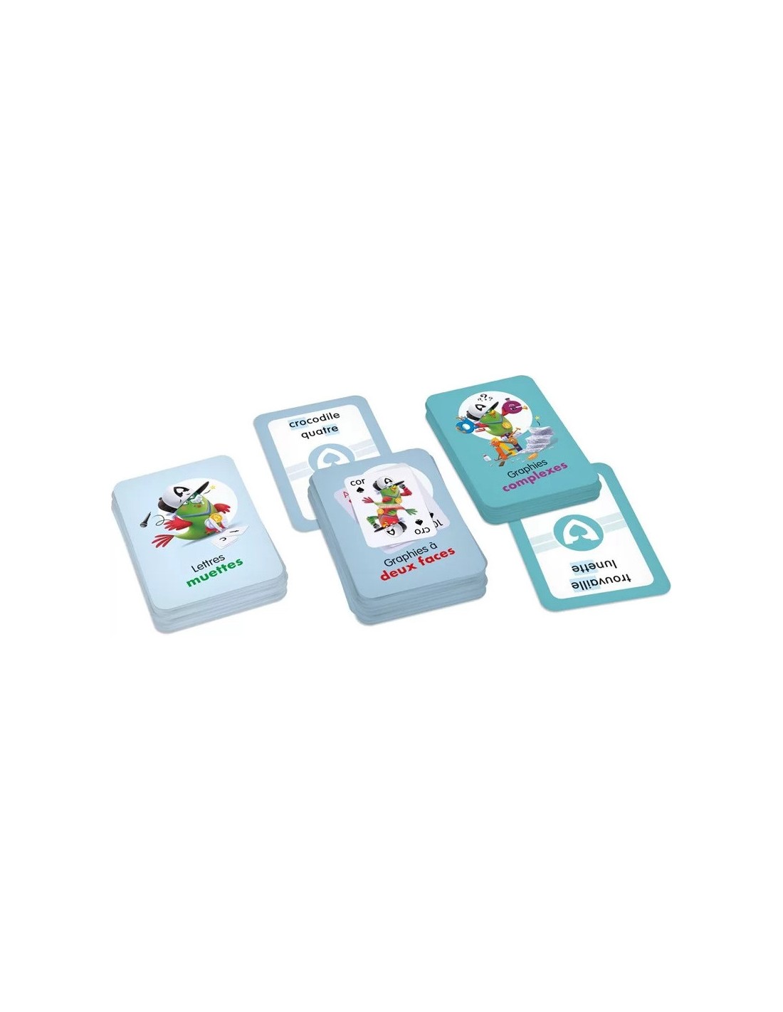 L’as de la lecture 2 est composé de trois jeux de cartes qui permettent à l’enfant de s’exercer à lire des mots communs plus complexes à décoder en raison du nombre de lettres utilisées pour produire un son (p. ex., aille, ouille), de l’ordre dans lequel les lettres sont placées (p.