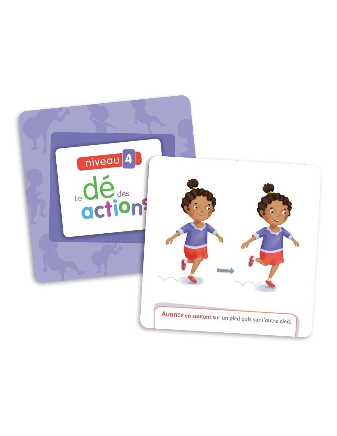 - Le niveau 4 s’adresse aux enfants de 4 à 6 ans et propose des actions telles que sauter comme en jouant à la marelle, avancer en sautant sur un pied, se déplacer en faisant la brouette et marcher en mettant une carte en équilibre sur sa tête.
