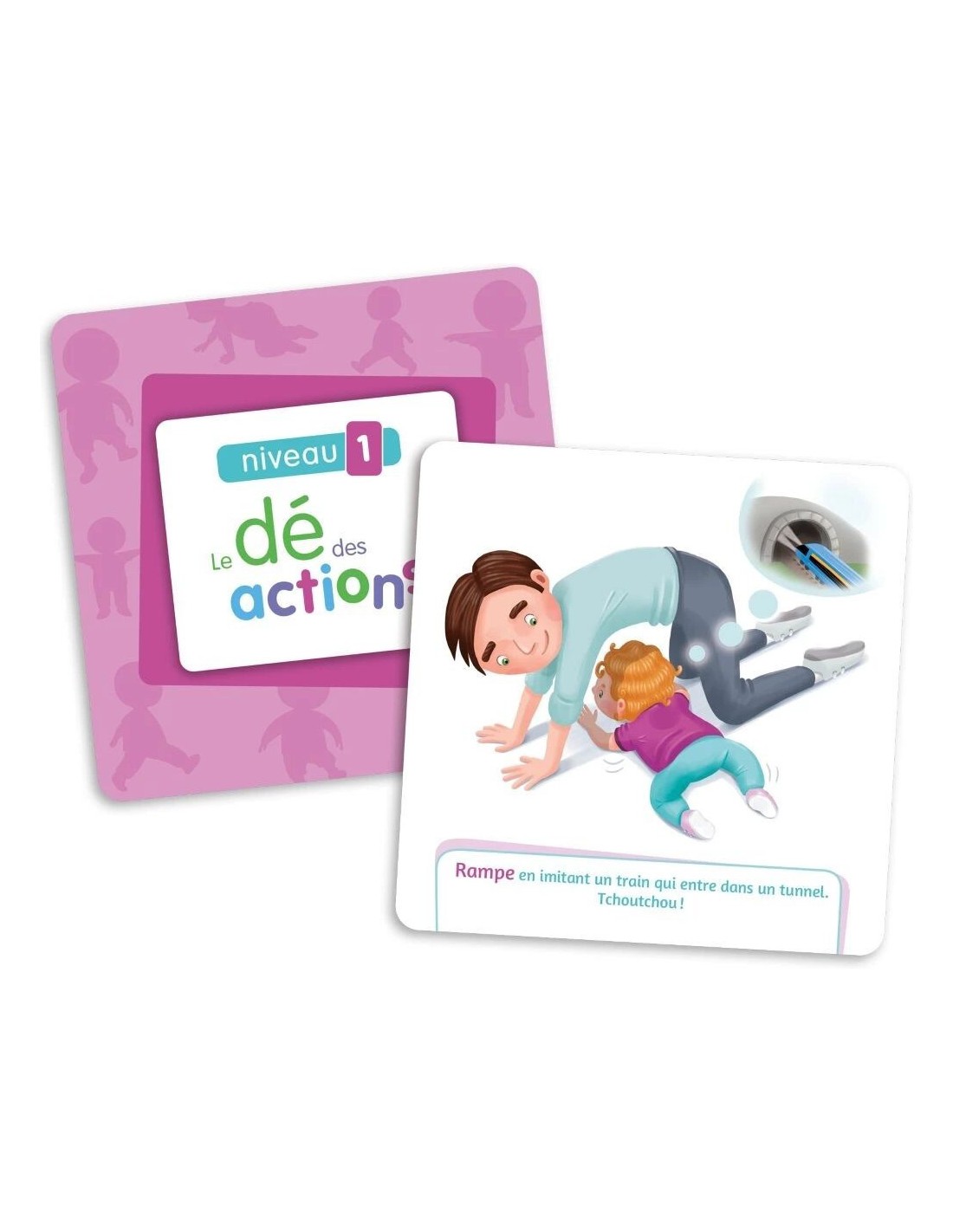 - Le niveau 1 s’adresse aux enfants de 1 à 2 ans et propose des actions telles que ramper, marcher à quatre pattes, faire rouler le dé et marcher comme un animal (avec l’aide d’un adulte au besoin).