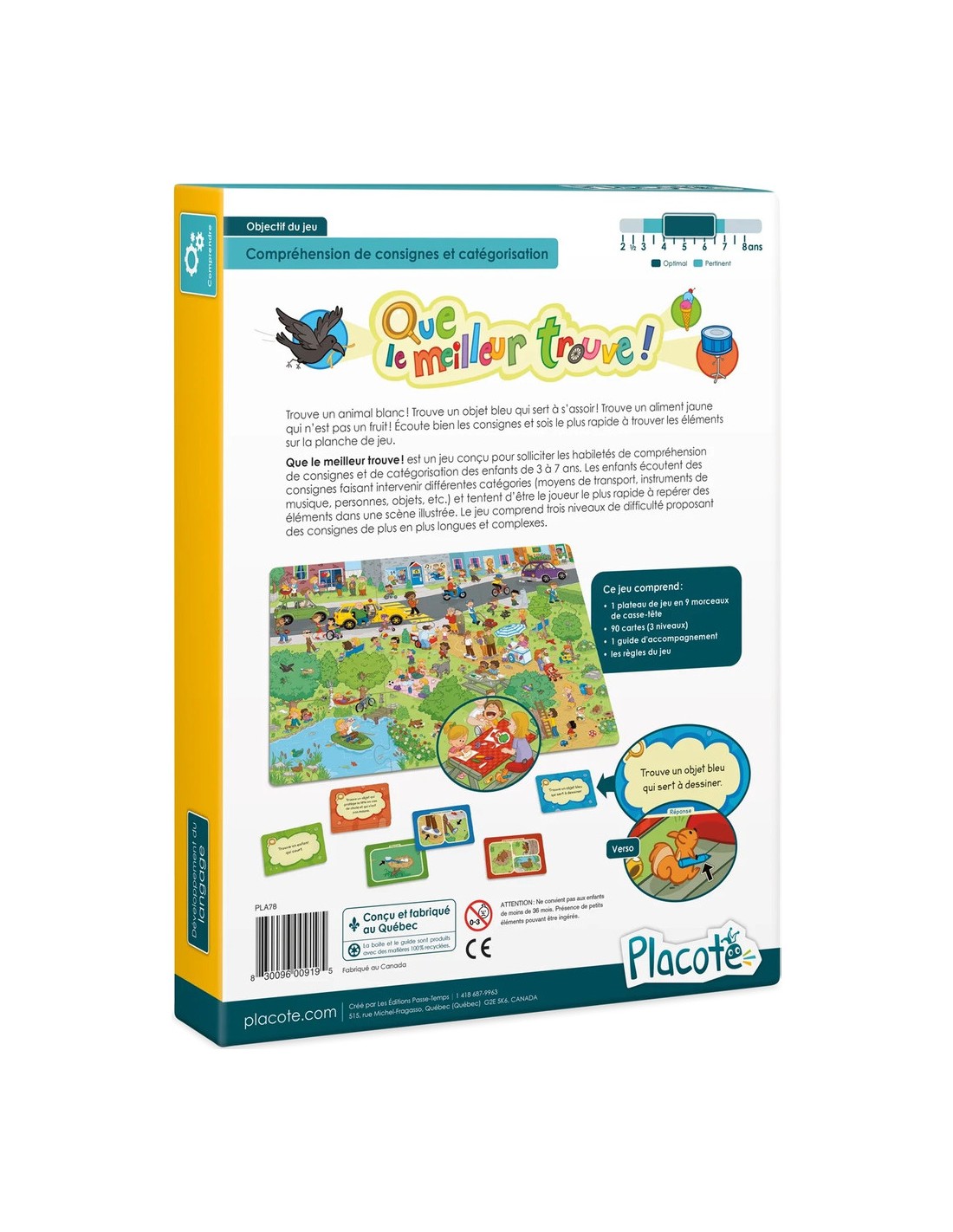 Jeu conçu pour solliciter les habiletés de compréhension de consignes et de catégorisation. Les enfants écoutent des consignes faisant intervenir différentes catégories et tentent d’être le joueur le plus rapide à repérer des éléments dans une scène illustrée.