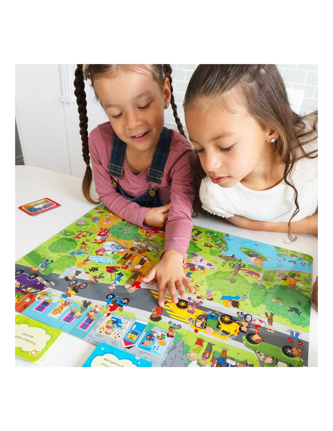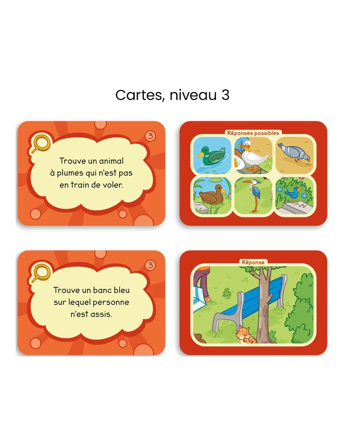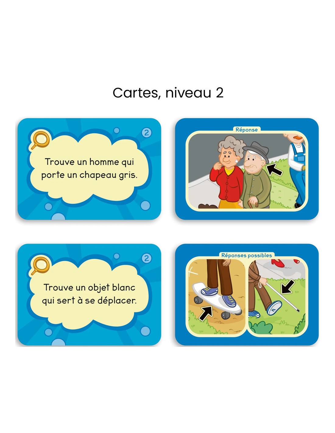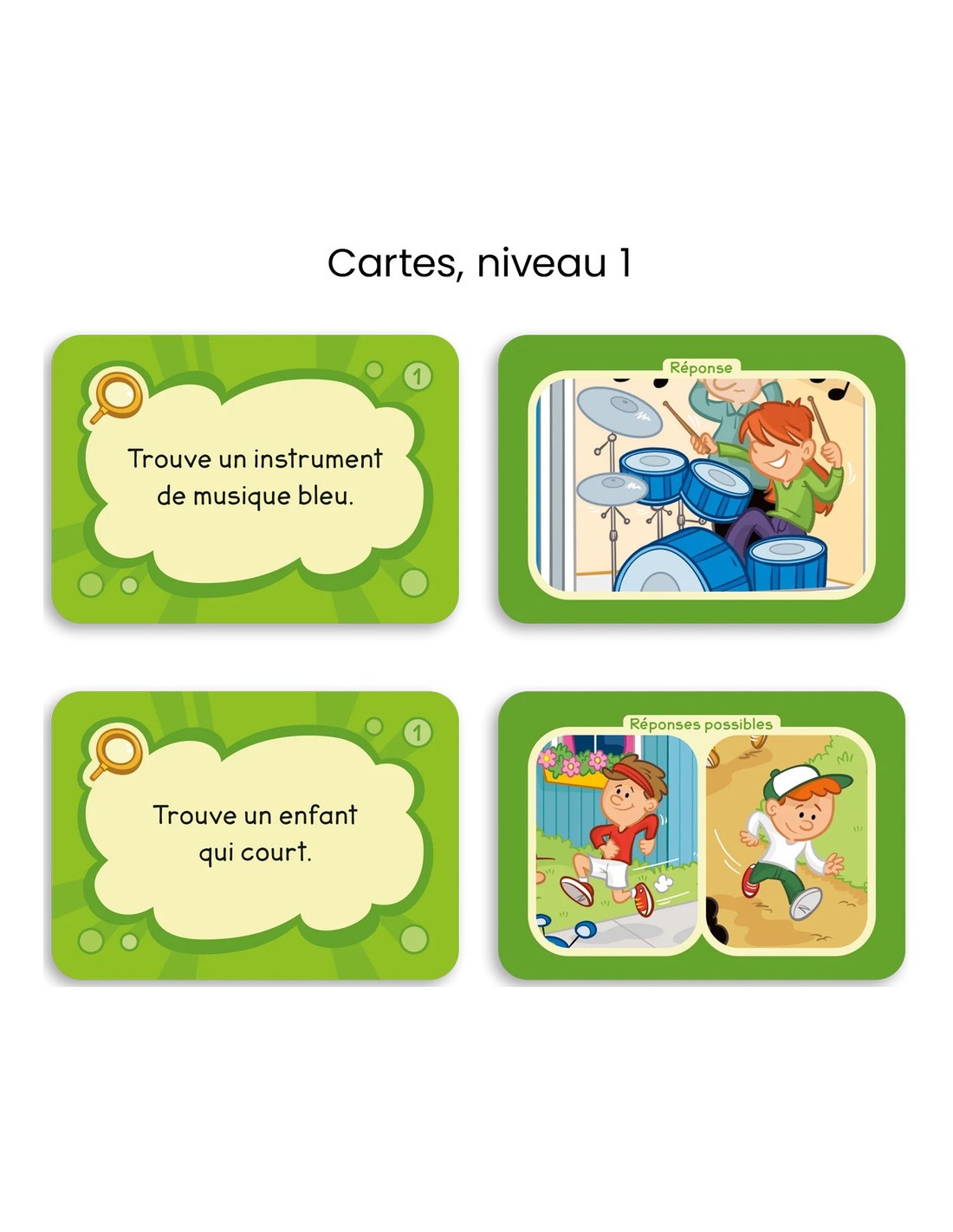 Jeu de langage dans lequel les joueurs doivent être les plus rapides pour repérer dans une scène illustrée des éléments qui correspondent à des consignes entendues afin de remporter des cartes. Le joueur qui amasse le plus de cartes remporte la partie.