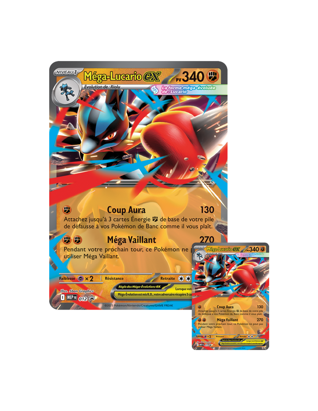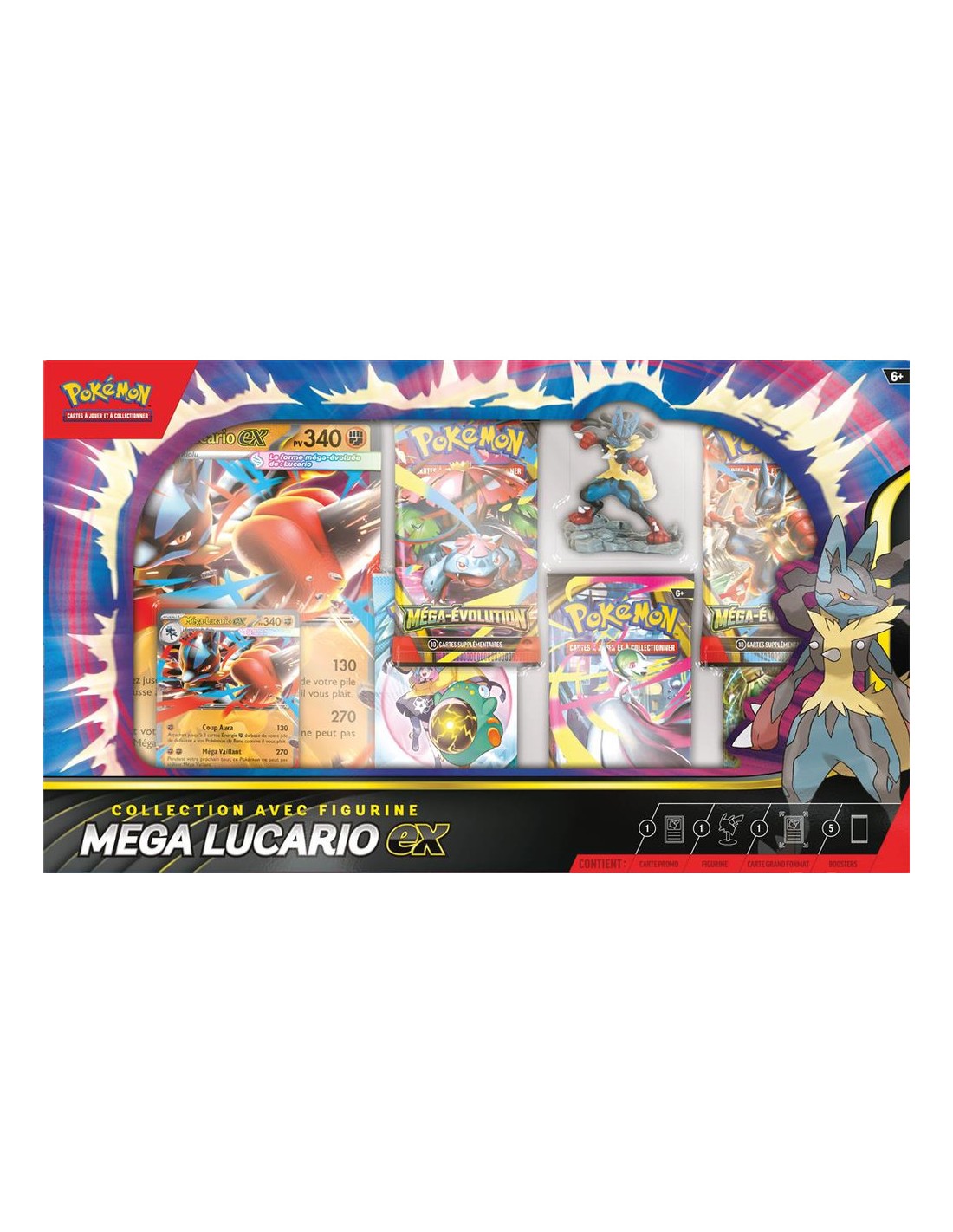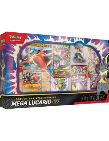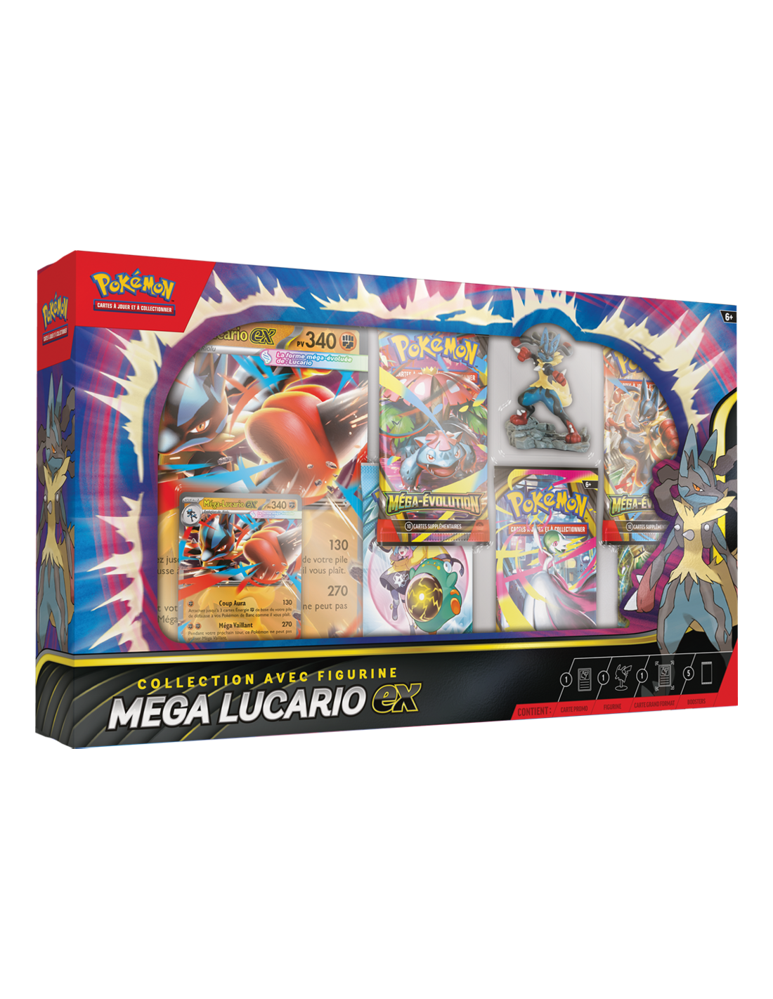 Vous trouverez également d’autres superbes Pokémon dans les boosters inclus. Contenu : 1 carte promo texturée brillante de Méga-Lucario-ex, 1 carte promo grand format de Méga-Lucario-ex, 1 figurine de Méga-Lucario, 5 boosters du Jcc Pokémon , 1 carte à code pour le Jcc Pokémon Live