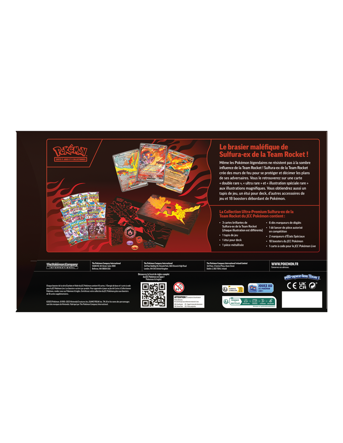 Vous obtiendrez aussi un tapis de jeu, un étui pour deck, d’autres accessoires de jeu et 18 boosters débordant de Pokémon. Contenu :3 cartes brillantes de Sulfura-ex de la Team Rocket (chaque illustration est différente) , 1 tapis de jeu, 1 étui pour deck, 1 pièce métallisée, 6 dés marqueurs de dégâts, 1 dé lancer de pièce autorisé en compétition, 2 marqueurs d’États Spéciaux, 18 boosters du Jcc Pokémon, 1 carte à code pour le Jcc Pokémon Live