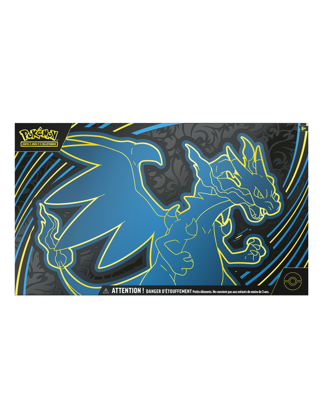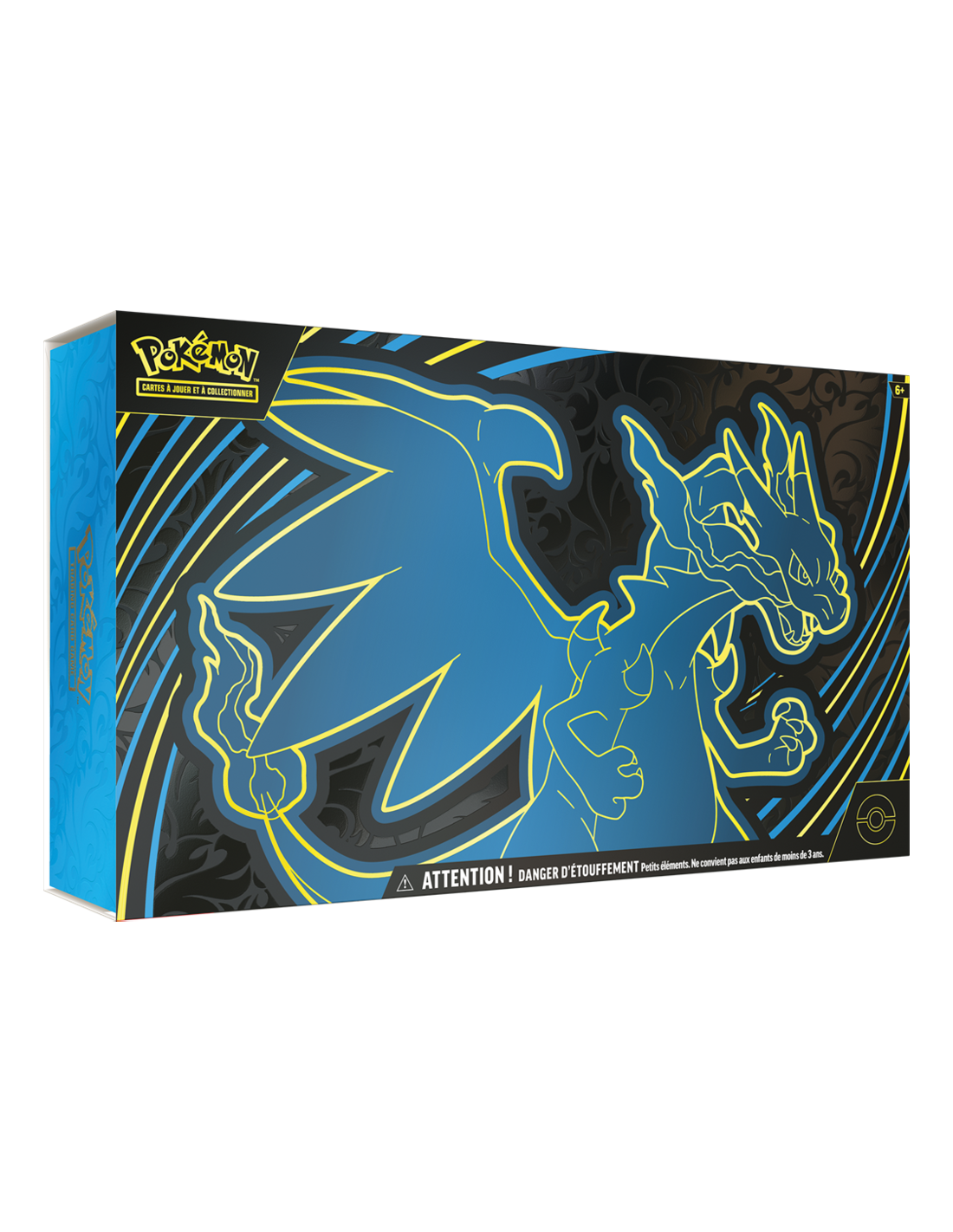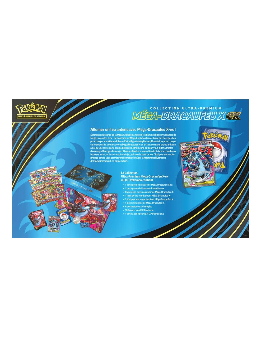 Contenu :1 carte promo brillante de Méga-Dracaufeu X-ex, 1 carte promo brillante de Plumeline-ex, 65 protège-cartes au motif de Méga-Dracaufeu X, 1 tapis de jeu représentant Méga-Dracaufeu X, 1 étui pour deck représentant Méga-Dracaufeu X, 1 pièce métallisée de Méga-Dracaufeu X, 6 dés marqueurs de dégâts, 18 boosters du Jcc Pokémon, 1 carte à code pour le Jcc Pokémon