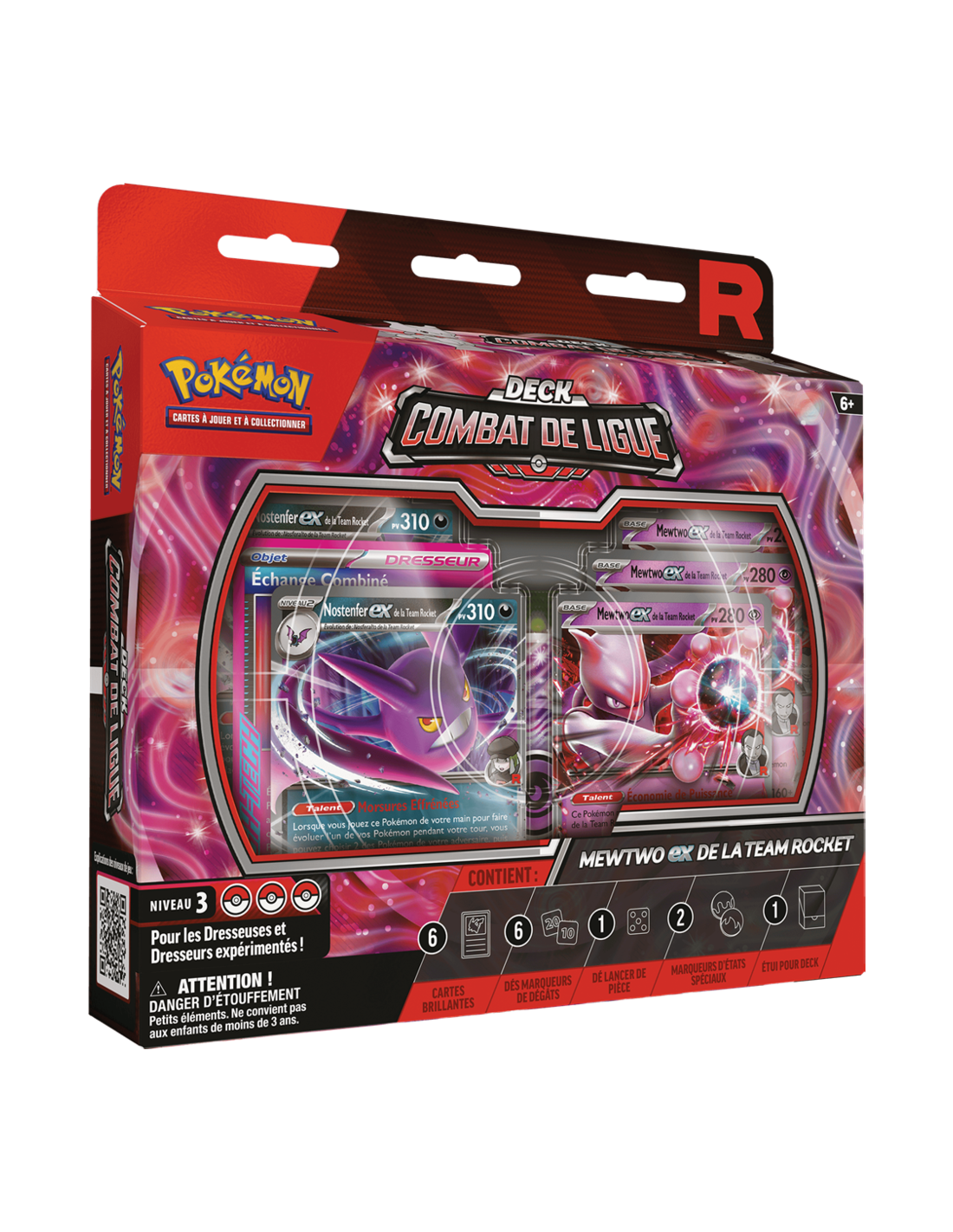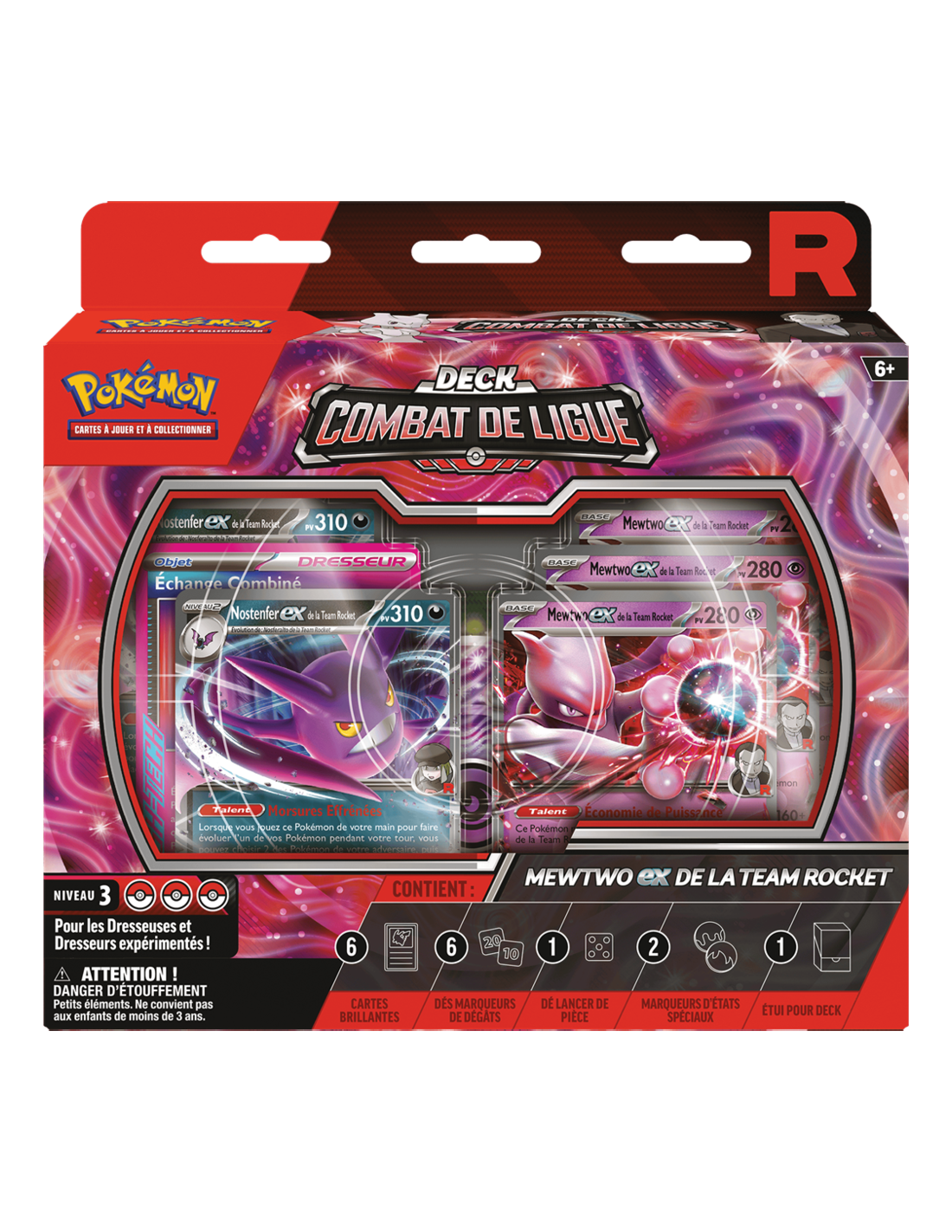 Montrez votre côté sombre en affrontant vos adversaires avec une équipe de puissants Pokémon menés par Mewtwo-ex de la Team Rocket. Ce Deck Combat de Ligue est un deck de 60 cartes prêt à l’emploi du Jeu de Cartes à Collectionner contenant de nombreux Pokémon de la Team Rocket et membres de cette infâme organisation en tant que cartes Dresseur. Que vous jouiez gentiment//en toute bienveillance ou que vous combattiez d’une façon plus fourbe, vous aurez toute la puissance de la Team Rocket à vos côtés avec ce Deck Combat de Ligue.Ce Deck Combat de Ligue Mewtwo-ex de la Team Rocket du Jcc Pokémon contient :