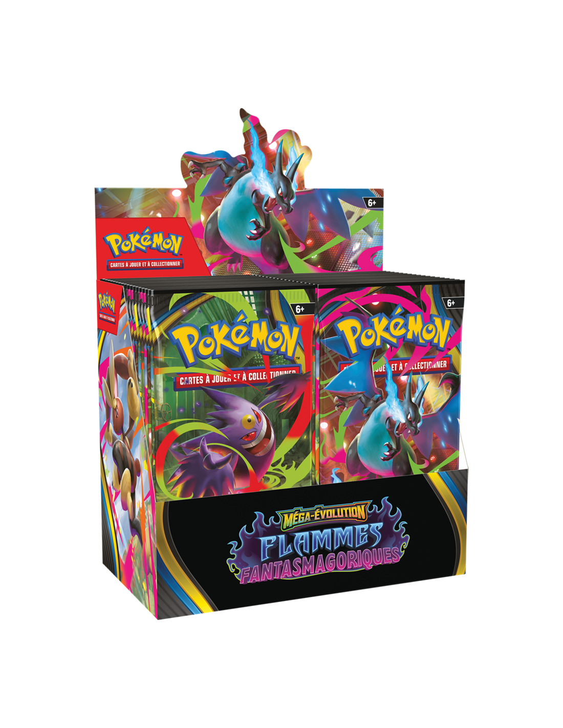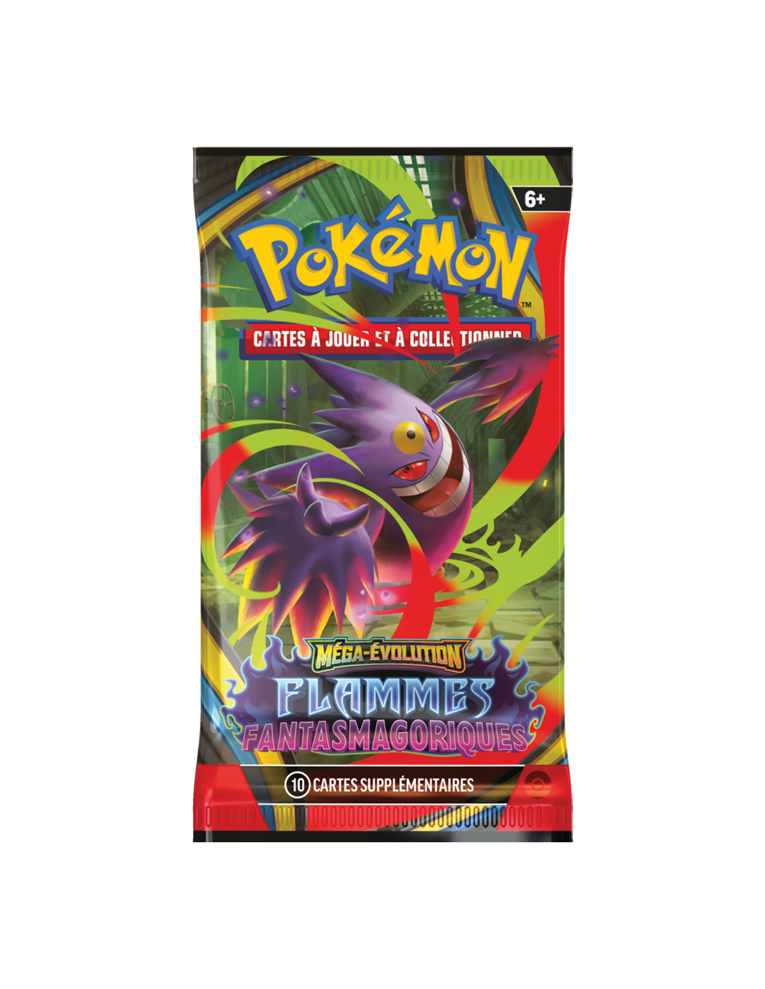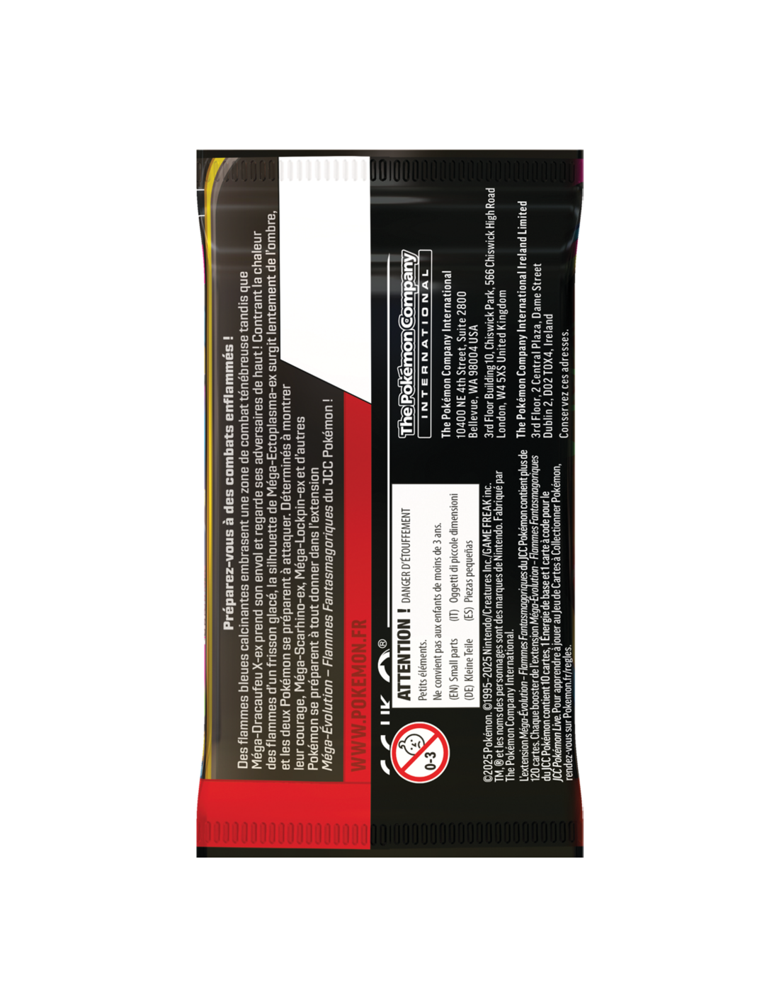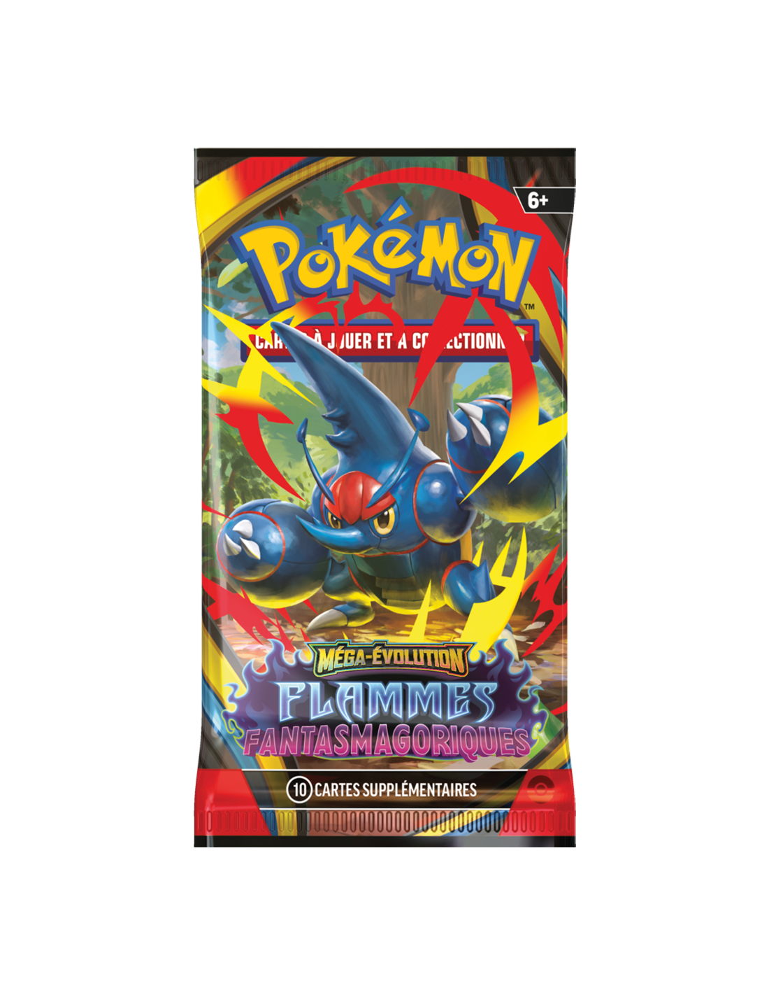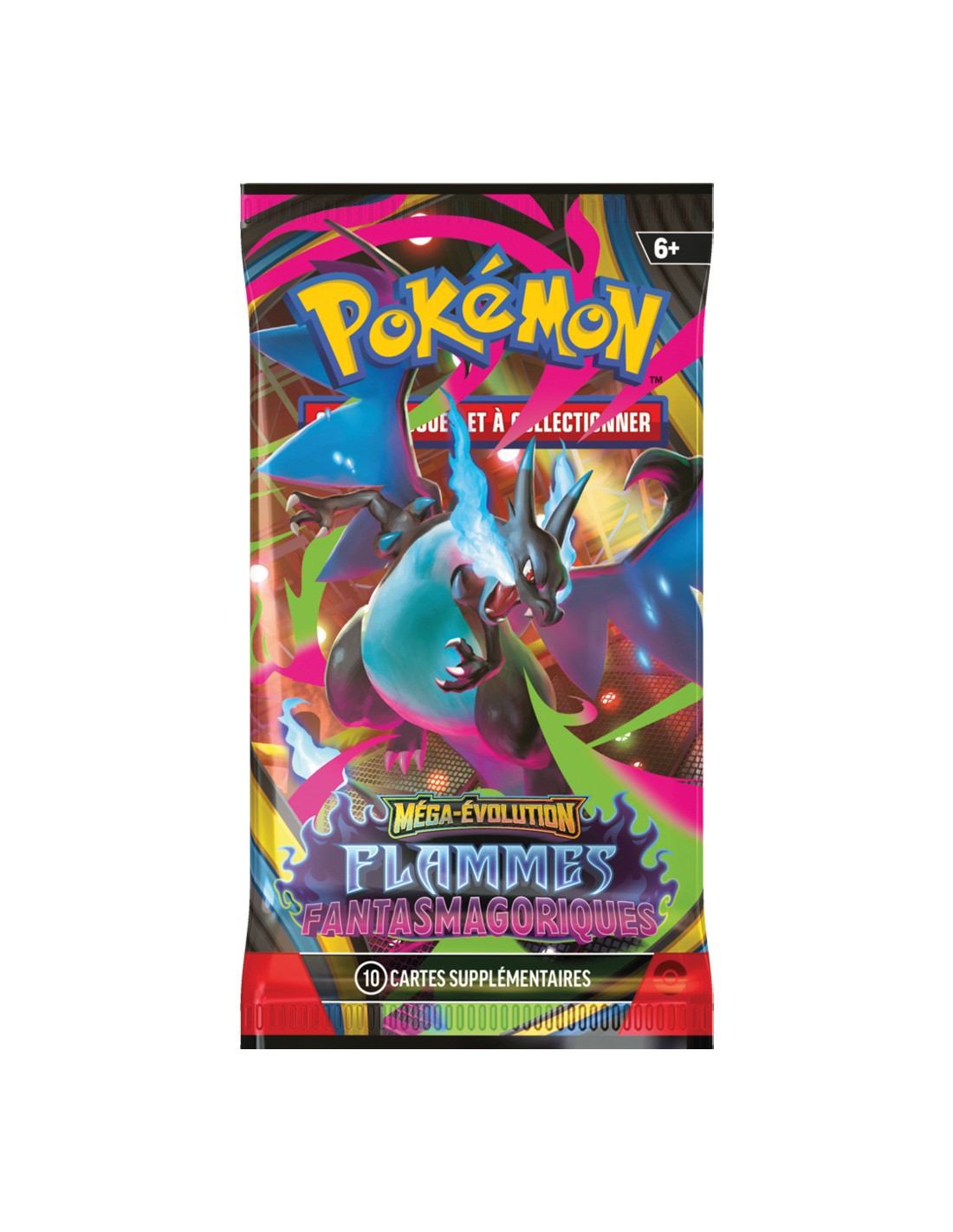 Chaque booster de l'extension Méga-Évolution du JCC Pokémon contient 10 cartes, 1 énergie de base ou 1 carte à code pour le JCC Pokémon Live.